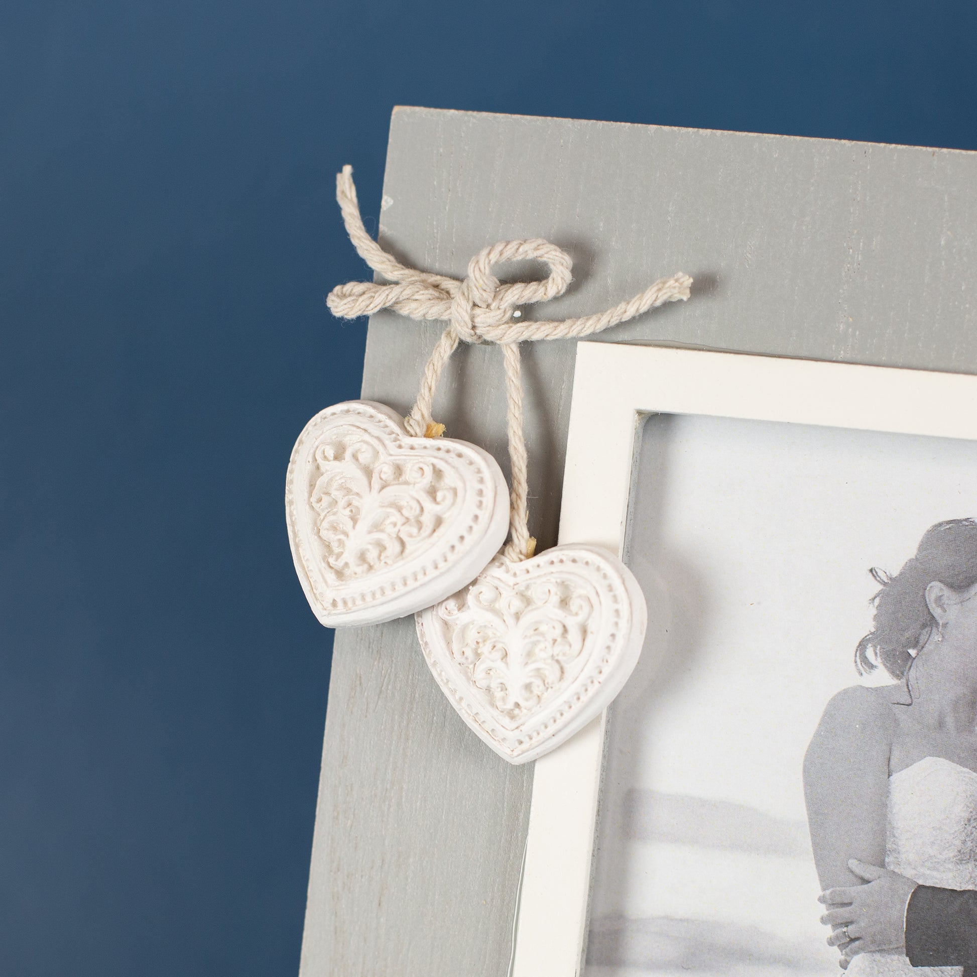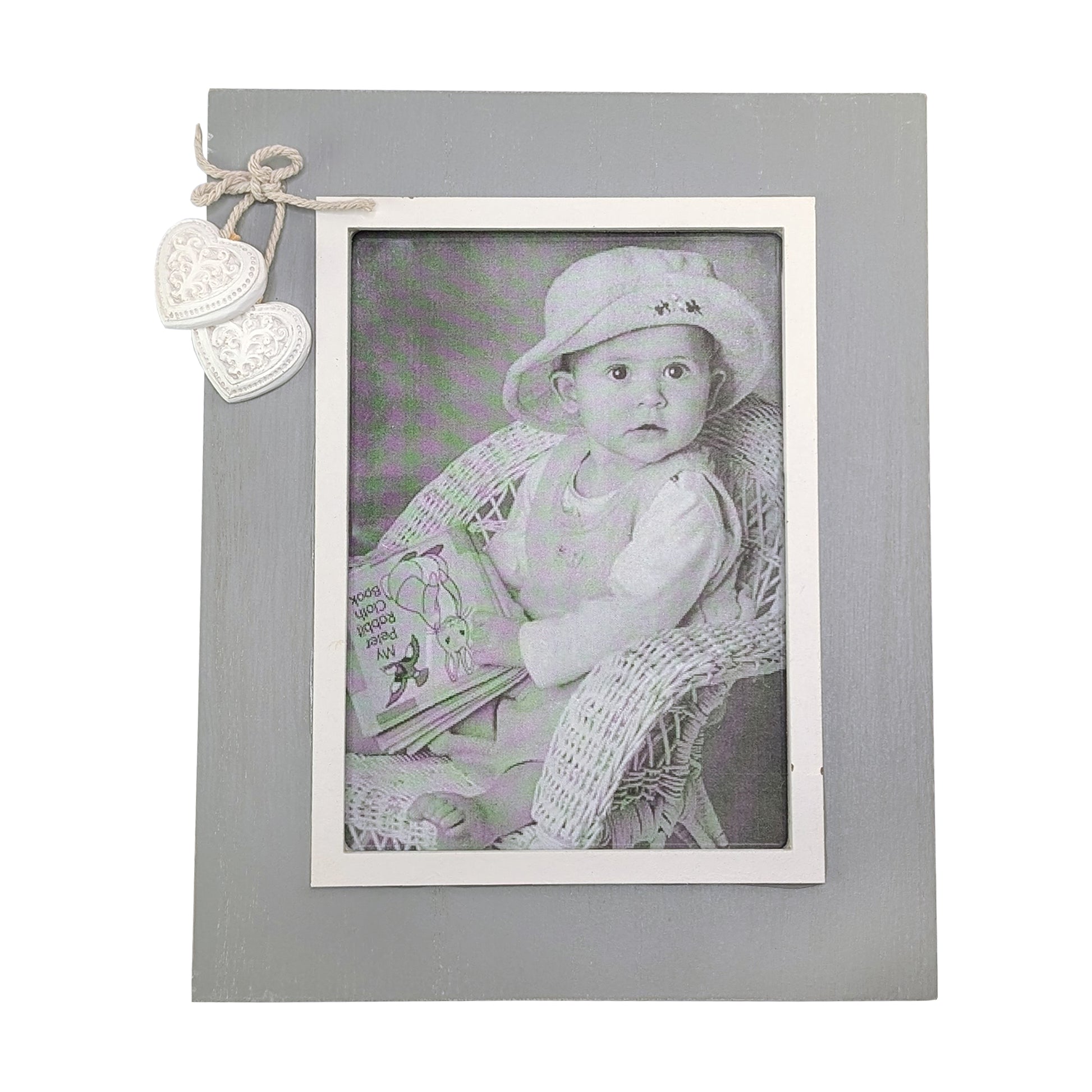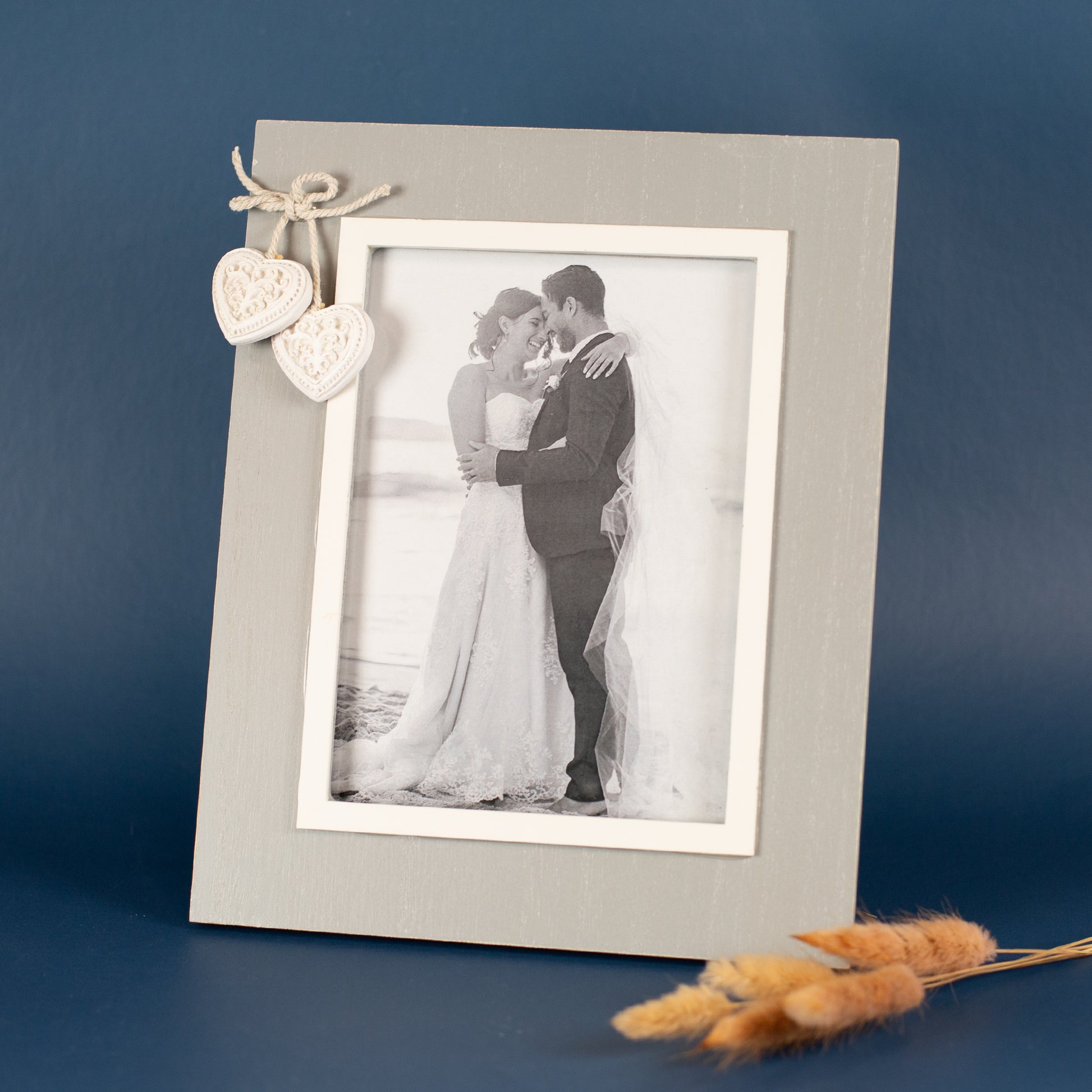 Dieser stilvolle Bilderrahmen in dezentem Grau ist nicht nur ein schönes Wohnaccessoire, sondern auch ein liebevolles Präsent für besondere Momente. Ein besonderes Detail sind die beiden kleinen, weißen Deko-Herzen, die an einer Juteschnur in der linken oberen Ecke befestigt sind – sie verleihen dem Rahmen eine charmant-romantische Note.
