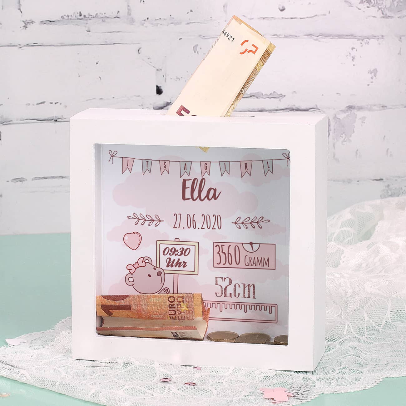 Mit unserer bedruckten Bilderrahmenspardose können Sie im Handumdrehen ein wunderschönes Geldgeschenk zur Geburt zaubern. Die Rückwand der Spardose wird mit unserem niedlichen Teddymotiv zur Geburt bedruckt. Das Motiv beinhaltet den Namen der neuen Erdenbürgerin, das Datum der Geburt sowie die Uhrzeit, die Größe und das Gewicht. Eine Wimpelkette mit der Aufschrift "Its a girl", der niedliche Teddy und rosane Wölkchen runden das Motiv ab.