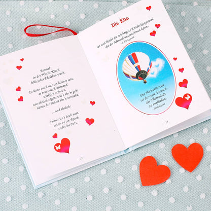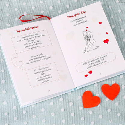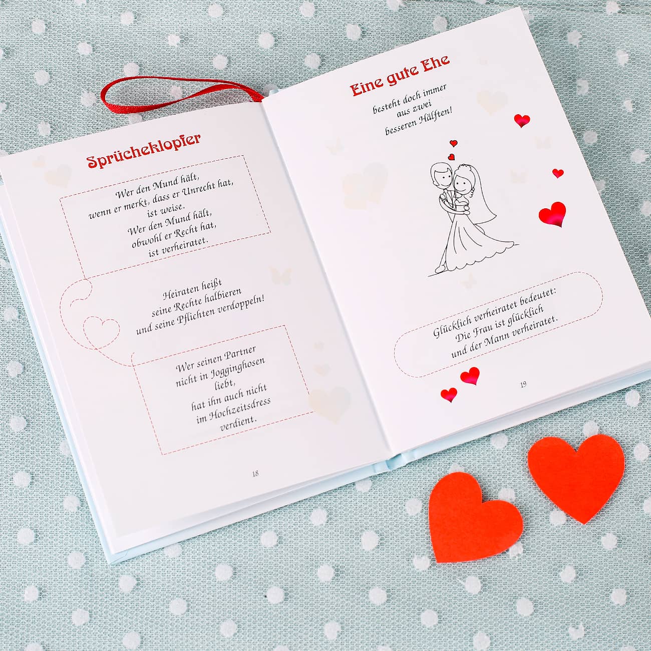 In diesem kleinen Büchlein stehen Lieder, Witze, Gedichte und Weisheiten rund um das Thema Ehe geschrieben. Mit diesem Buch als Geschenk zur Hochzeit startet das frisch verheiratete Paar Flott in die Ehe.