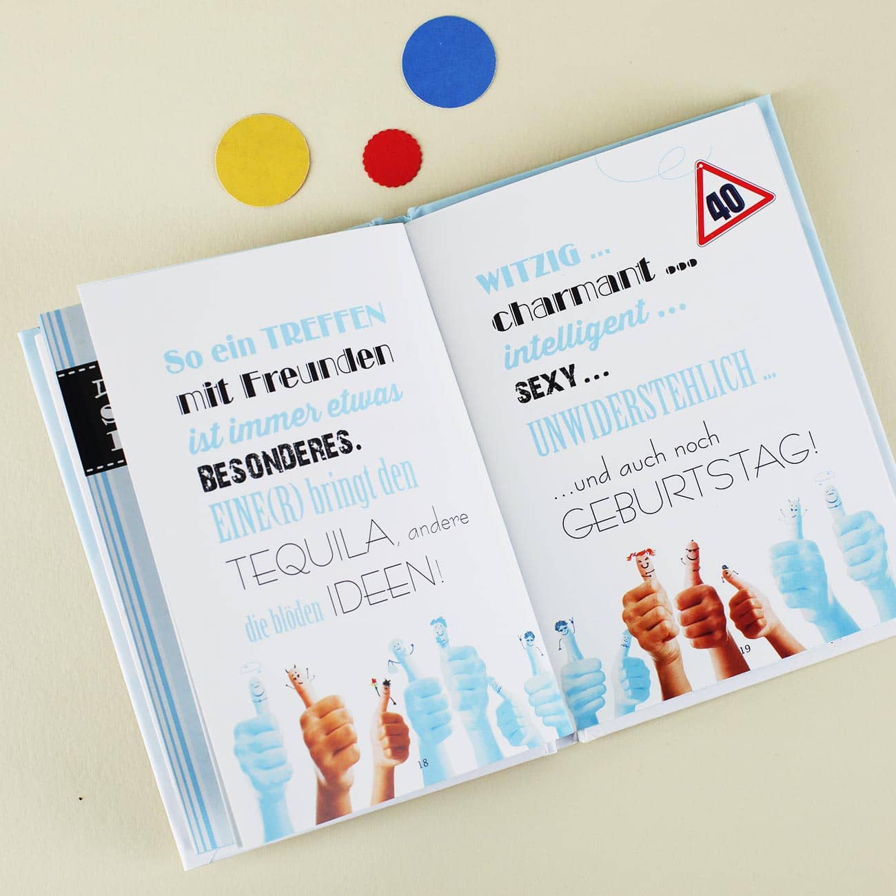 Zum runden 40. Geburtstag kann das Geldgeschenk gerne etwas origineller ausfallen. Mit diesem Buch für Geldgeschenke zum 40. Geburtstag verschenken Sie nicht nur eine Finanzspritze, sondern auch eine große Portion Humor und Fröhlichkeit. 27 Seiten in diesem Buch sind mit Sprüchen und Bildern voller Fröhlichkeit, Motivation und Spaß befüllt. Um Fehlkäufe zu vermeiden sind Geldgeschenke eine gute Alternative für ein Präsent, das jeder benötigt. Nicht nur von innen überzeugt das Buch, sondern auch das Hardcover glänzt auf den ersten Blick. Zu sehen ist der rote Umschlag durch eine Aussparung im Buchdeckel. Dieser wird umrahmt von einem Verkehrsschild mit einer 40 und einem Ortsschild mit den Worten "Spitzen-Alter". Hinzu kommen noch bunte Luftballons passend zum 40. Geburtstag. Originelle Geburtstagsgeschenke wie das Buch sind immer eine gelungene Überraschung!