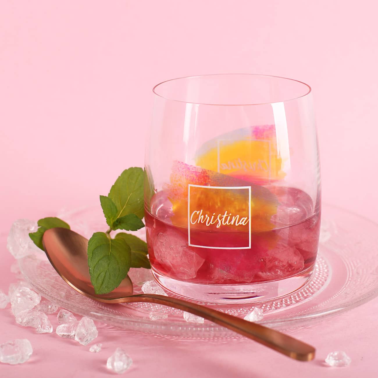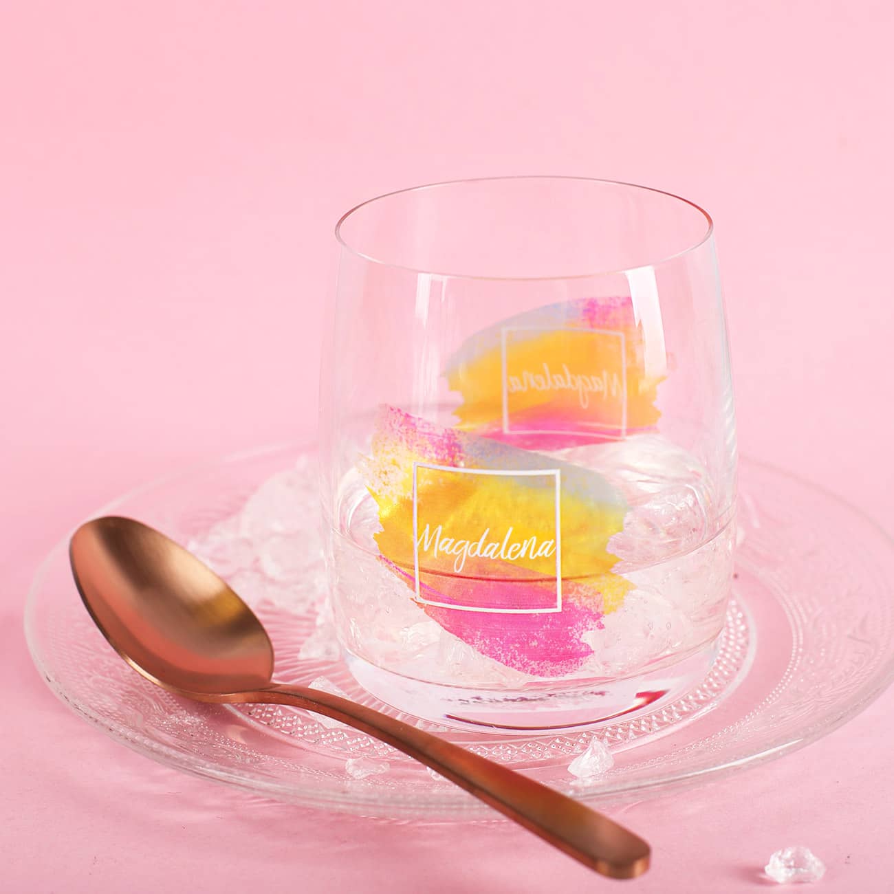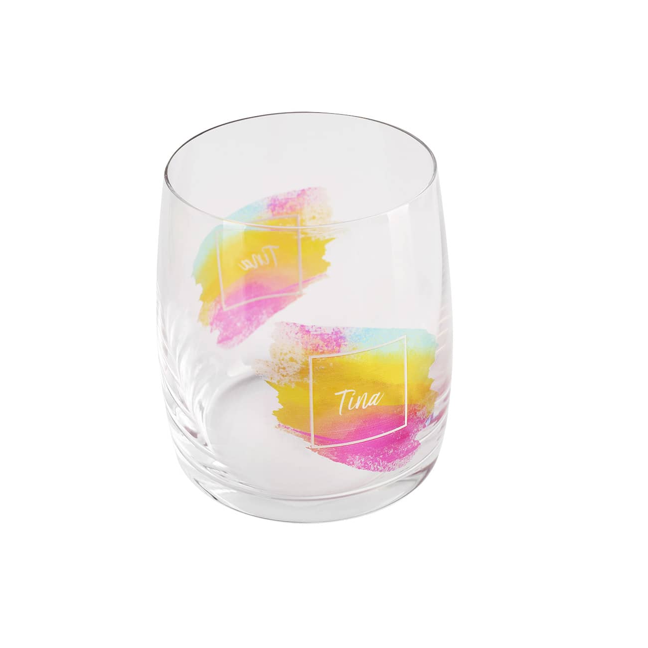 Bunt bedrucktes Wasserglas mit Namensaufdruck