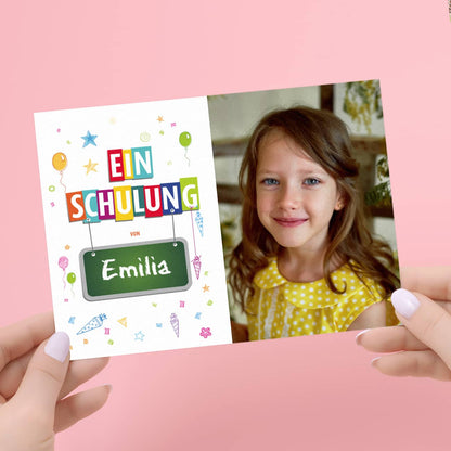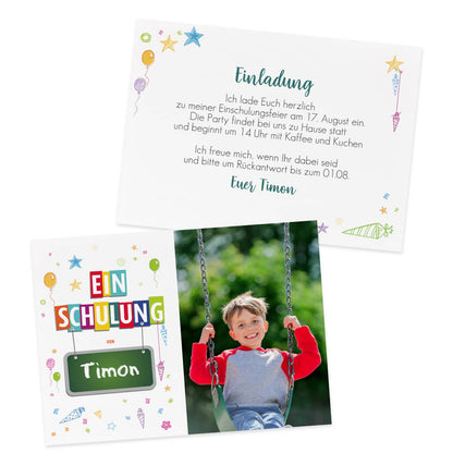 Planen Sie eine besondere Feier zum Schulanfang? Unsere Einladungskarte mit einem zauberhaften Motiv bietet die ideale Möglichkeit, Ihre Gäste herzlich einzuladen. Die Vorderseite kann mit dem Name und Foto des Kindes personalisiert werden. Diese Einladungskarte besticht nicht nur durch ihr farbenfrohes Design, sondern auch durch ihre praktischen Eigenschaften. Mit beidseitigem Druck haben Sie ausreichend Platz, um alle wichtigen Informationen für Ihre Veranstaltung festzuhalten. Von Datum und Uhrzeit bis hin zu besonderen Anweisungen für Ihre Gäste - lassen Sie Ihrer Kreativität freien Lauf.