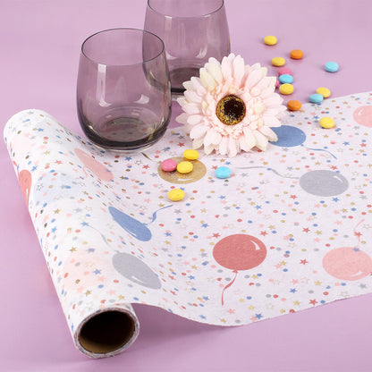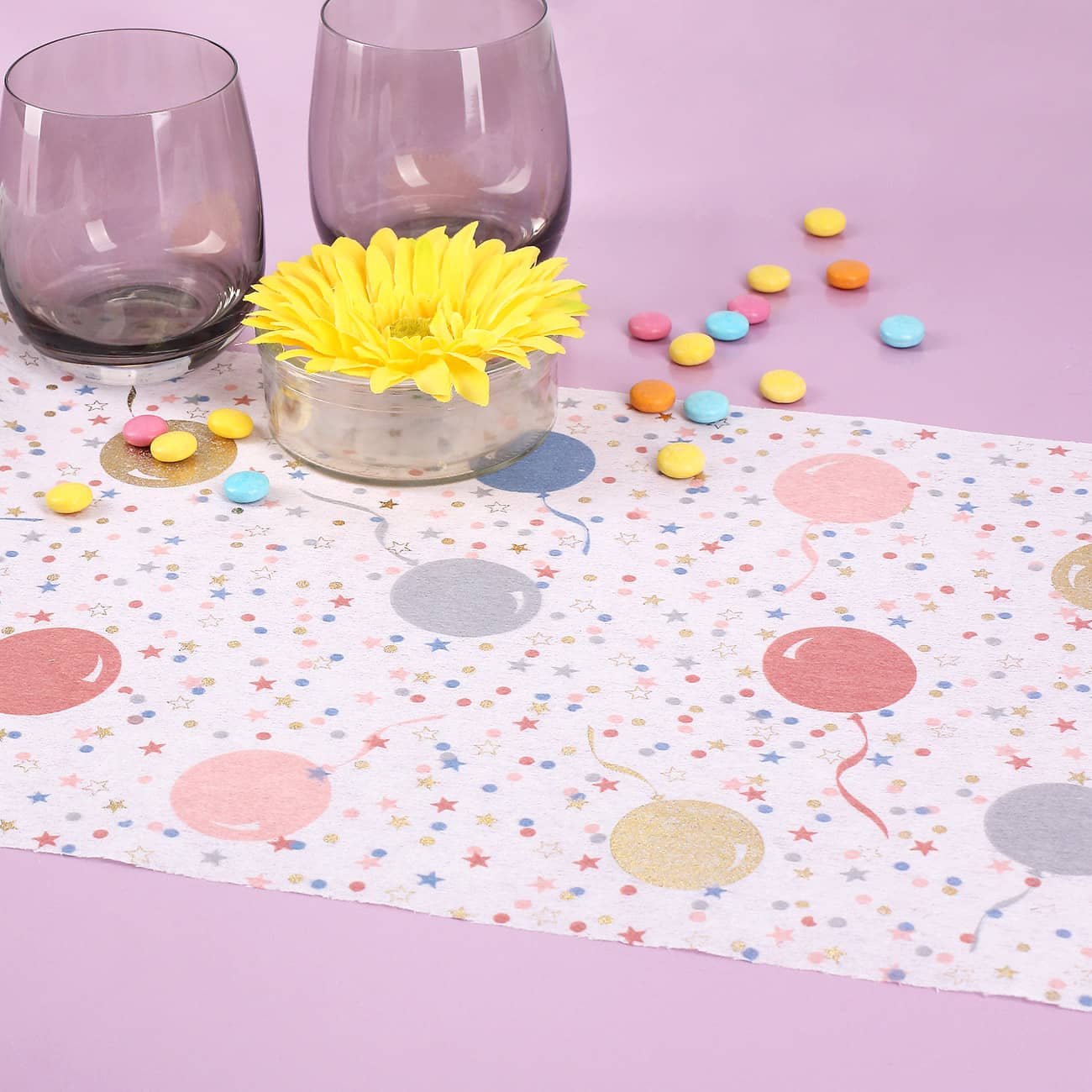 Diese Geburtstagstischläufer passt zu jedem Kindergeburtstag. Er besteht aus weichem Vlies und ist mit bunten Luftballons, Sternen und Punkten bedruckt. Der besondere Eyecatcher sind die goldenen Ballons im Motiv.