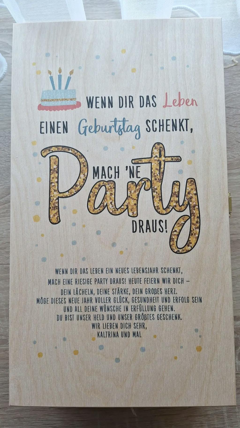 Der Deckel dieser Holzbox trägt den Spruch - Wenn dir das Leben einen Geburtstag schenkt, mach 'ne Party draus! Ergänzt mit Ihrem selbst verfassten Glückwunschtext ist das Champagnerset ein echter Partykracher.