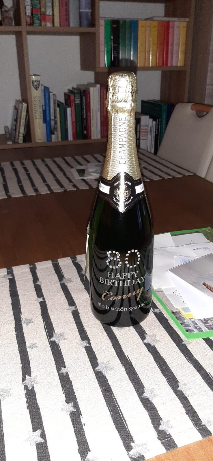 Vielen Dank für diese, so liebevoll, gestaltete Champagnerflasche zum 80. Geburtstag, mein Schwager und seine Gäste waren davon sehr angetan und haben noch am selben Abend nachgefragt, wo es so wunderbare Geschenke gibt. ( Hab ich natürlich verraten!!! )