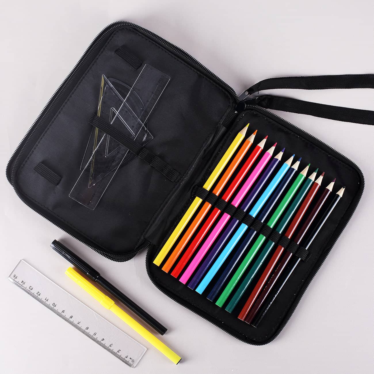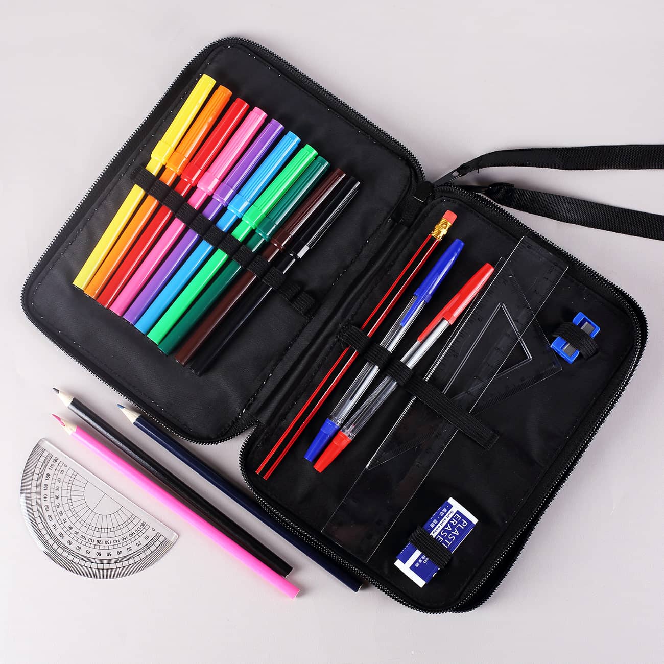 Damit man sofort mit dem Kreativsein loslegen kann, liefern wir die Federmappe mit einem umfangreichen Inhalt an hochwertigen Schreibutensilien. Sie erhalten 12 Buntstifte und 10 Filzstifte in lebendigen Farben, um Ihren Zeichnungen und Skizzen Leben einzuhauchen. Ein Bleistift steht für präzisere Arbeiten zur Verfügung, während der Radiergummi und der Anspitzer für Korrekturen und Spitzen sorgen. Zusätzlich zu den Farbstiften und dem Bleistift finden Sie zwei Lineale, zwei Dreiecke und einen Winkelmesser in der Federmappe. Diese Werkzeuge sind ideal, um präzise Messungen und Winkel zu zeichnen, sei es für mathematische Aufgaben oder technische Zeichnungen. Zwei Kugelschreiber runden das Set ab und ermöglichen das schnelle Festhalten von Notizen oder das Unterstreichen wichtiger Informationen.