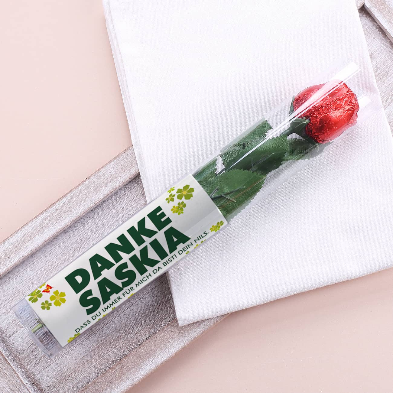 Die Schokorose als Dankeschön wird schon alleine ein wunderbarer Blickfang sein, aber wir werten das Ganze für Sie noch mehr auf. Verpackt wird die Schokorose als personalisiertes Geschenk in einer transparenten Verpackung, die einen Zettel mit einem individuellem Motiv erhält. Zu lesen ist der Schriftzug "DANKE", der mit einem Namen und Text Ihrer Wahl ergänzt wird. Ideen und Inspirationen für die Gestaltung können Sie aus unseren Produktbildern erhalten. Die Personalisierung wird mit einem wundervollen und frühlingshaften Motiv aus Blumen und Schmetterlingen abgerundet. Solch eine personalisierte Schokolade wird als Dankeschön Geschenk und als Muttertagsgeschenk eine einmalige Überraschung sein.