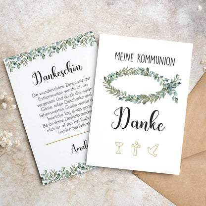 Möchten Sie Ihre Dankbarkeit und Wertschätzung für die Glückwünsche und Geschenke zur Taufe, Kommunion oder Konfirmation ausdrücken? Unsere Dankeskarte mit einem zarten Eukalyptusmotiv und einem symbolischen Fisch ist die perfekte Wahl. Diese stilvolle Karte ermöglicht es Ihnen, Ihre persönlichen Dankesworte individuell anzupassen und Ihre aufrichtige Freude über die Unterstützung und die guten Wünsche zum Ausdruck zu bringen. Wunderbar eignet sich die Dankeskarte auch als Wertschätzung für diejenigen, die zu den Feierlichkeiten erschienen sind.