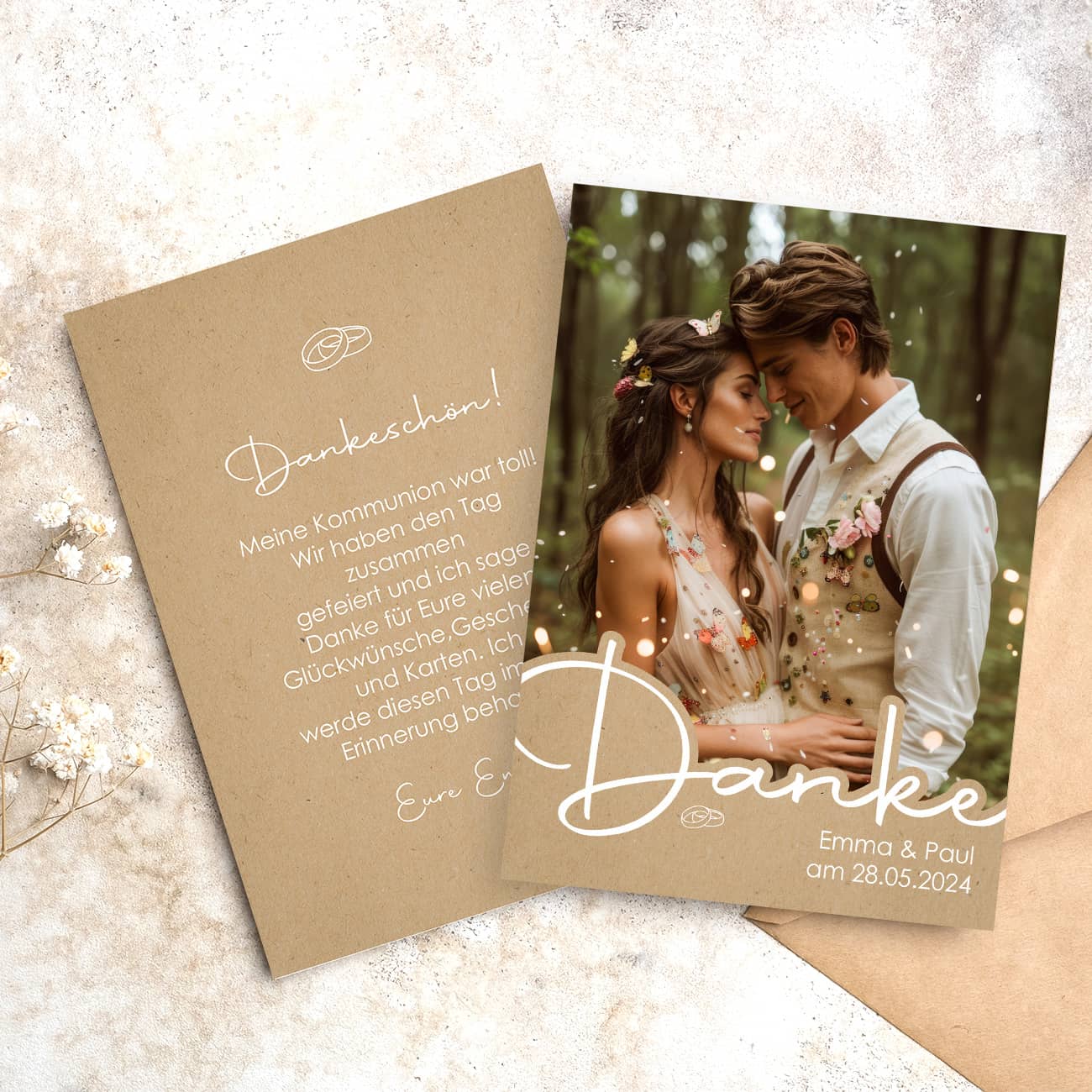 Sagen Sie "Danke" auf die eleganteste Weise mit unserer personalisierten Hochzeitskarte im Stil von Kraftpapier. Diese stilvolle Dankeskarte bietet Ihnen die Möglichkeit, Ihre Wertschätzung für Geschenke, Glückwünsche und die Anwesenheit Ihrer Gäste auf liebevolle Art und Weise auszudrücken. Die Karte wird mit einem Foto und Ihrem Text nach Wunsch personalisiert, sodass Sie genügend Platz für Ihre Gedanken und Dankesworte haben. Dank des praktischen Postkartenformats ist die Karte leicht zu versenden und erreicht Ihre Gäste schnell und unkompliziert.