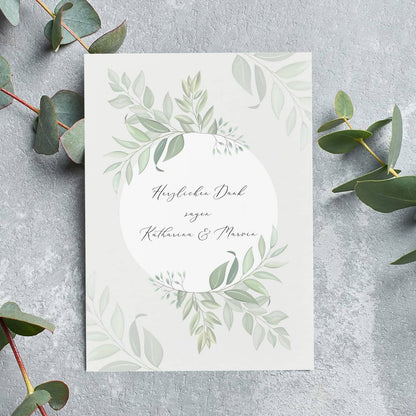 Übermitteln Sie Ihre Dankbarkeit stilvoll und persönlich mit unserer Dankeskarte zur Hochzeit, die mit einem eleganten Blättermotiv und Ihrem Hochzeitsfoto verziert ist. Diese individuell gestaltbare Karte ermöglicht es Ihnen, Ihre Wertschätzung für die Glückwünsche, Geschenke und die Anwesenheit Ihrer Gäste auf liebevolle Weise auszudrücken. Personalisieren Sie die Karte mit den Namen des Brautpaares und einem Wunschtext, um eine besondere Erinnerung an Ihren großen Tag zu schaffen. Ob Sie die Karte für Glückwünsche, Geschenke oder die Anwesenheit Ihrer Gäste verwenden – diese personalisierte Karte wird sicherlich gut ankommen und lange in Erinnerung bleiben.