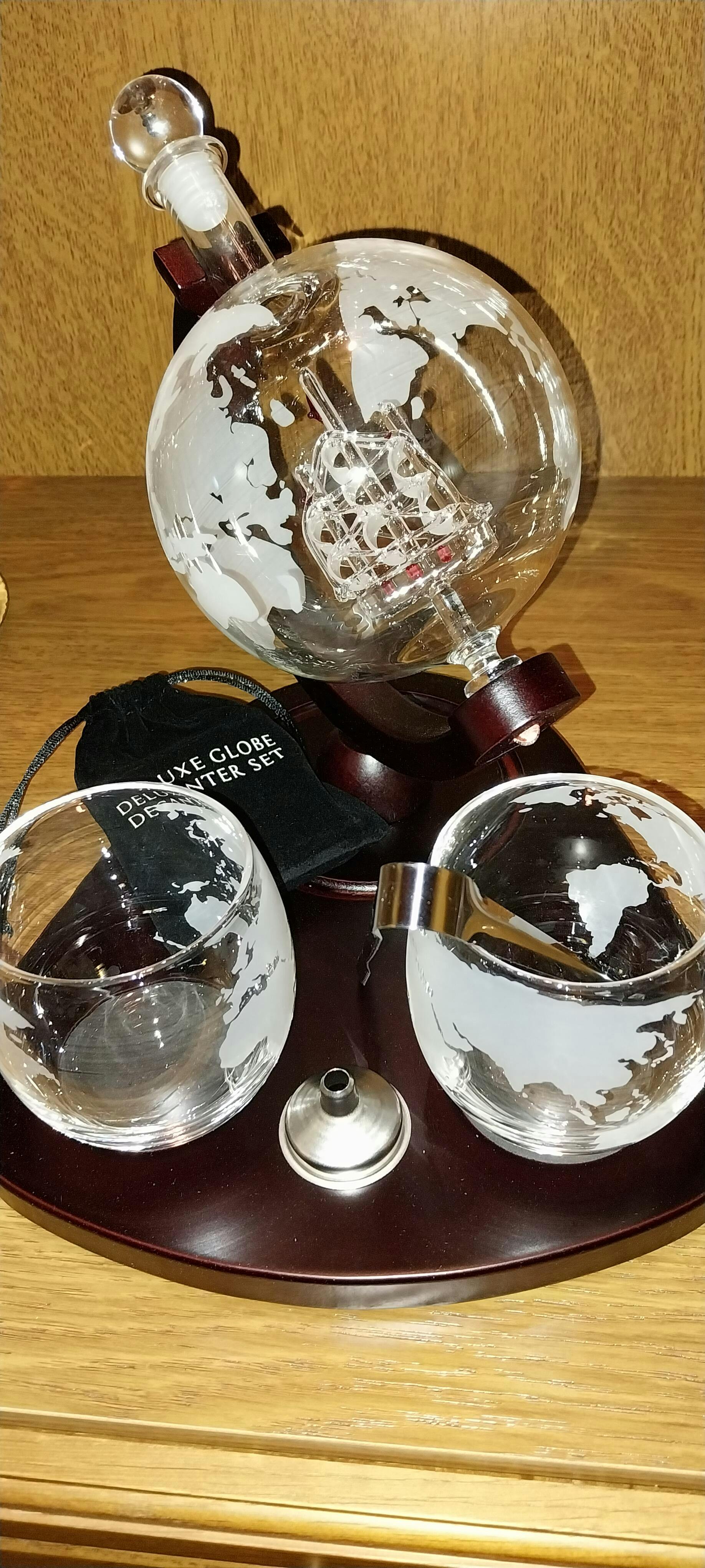 Dieser noble Deluxe Globe Decanter ist das perfekte Geschenk für wahre Whiskyliebhaber. Verschenken Sie ein Set, das den authentischen Geschmack des Getränks am besten hervorhebt. Die edle Karaffe mit Globus Optik beinhaltet eine Figur von einem mundgeblasenen Schiff, das das allgemeine Aussehen noch besser macht. Insgesamt lassen sich 850 ml des Getränks in die Karaffe füllen, sei es ein Whisky, ein Scotch oder ein Bourbon. Der Deckel mit Gummikappe sorgt hierbei für luftdichte frische. Der Dekanter lässt sich in den maßgeschneiderten Holzständer stellen und kann sogar sanft wie ein Globus gedreht werden. So luxuriös kann man das liebste Getränk genießen.