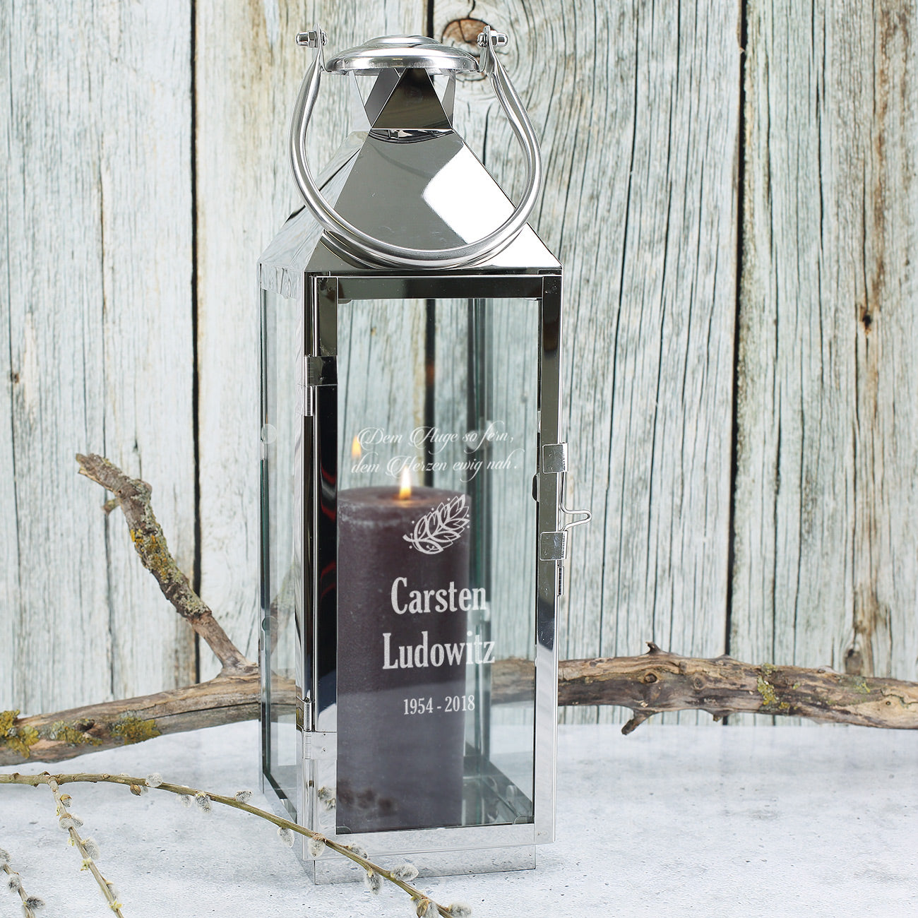 Dieser Spruch ist auf das Glas der großen Edelstahllaterne graviert, zusammen mit einem Blatt und Namen und Datum der geliebten Person. Verleihen Sie Ihrer Trauer Ausdruck und nutzen Sie diese Laterne als schöne Erinnerung an einen geliebten Menschen. Ebenso kann die Laterne auch für Beileidsbekundungen genutzt werden, um Ihren Beistand in einer schweren Zeit zu zeigen.