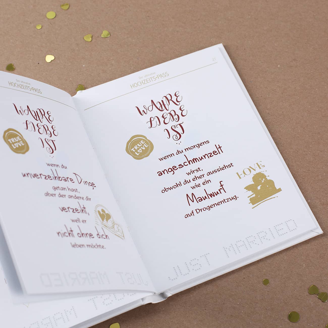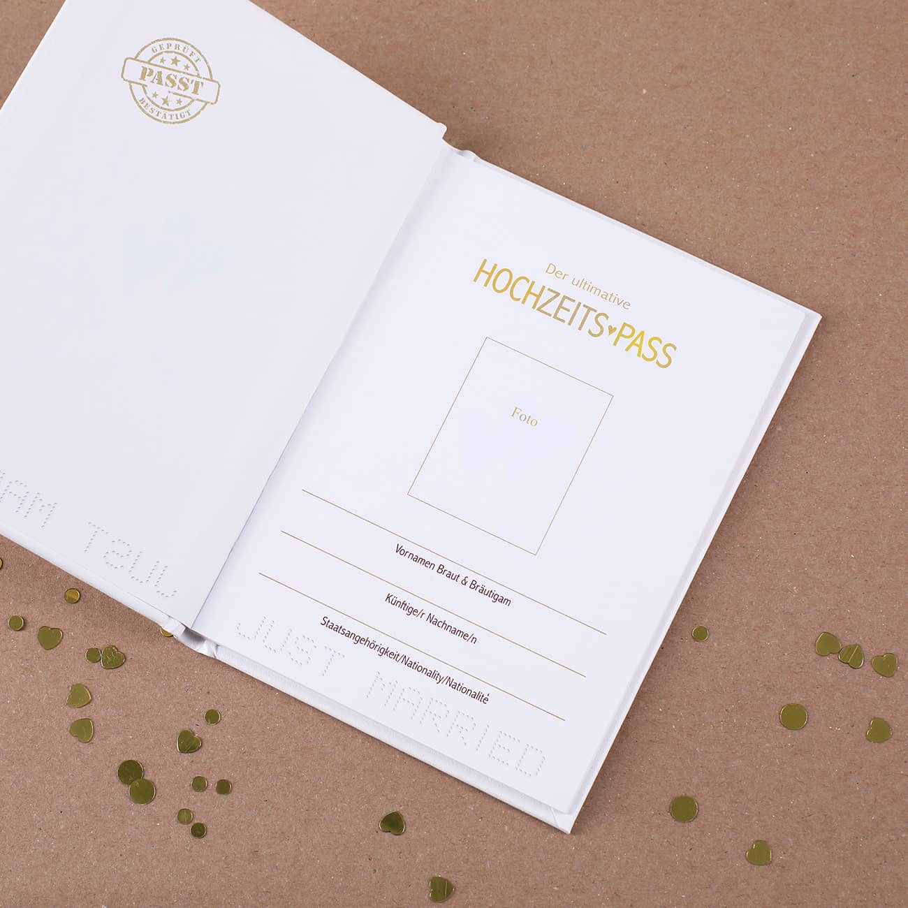 Damit die Hochzeit nicht nur standesamtlich und vielleicht auch kirchlich beurkundet wird – erst mit diesem Hochzeits-Pass ist das Ehegelübde vervollkommnet! In dem eleganten, weißen Pass mit goldener Aufschrift verbergen sich neben selbst einzutragenden Informationen zum Brautpaar auch herzerwärmende Sprüche, Weisheiten für die Ehe und das Eheglück sowie Witze, mit denen sich nur echt Paare identifizieren können.