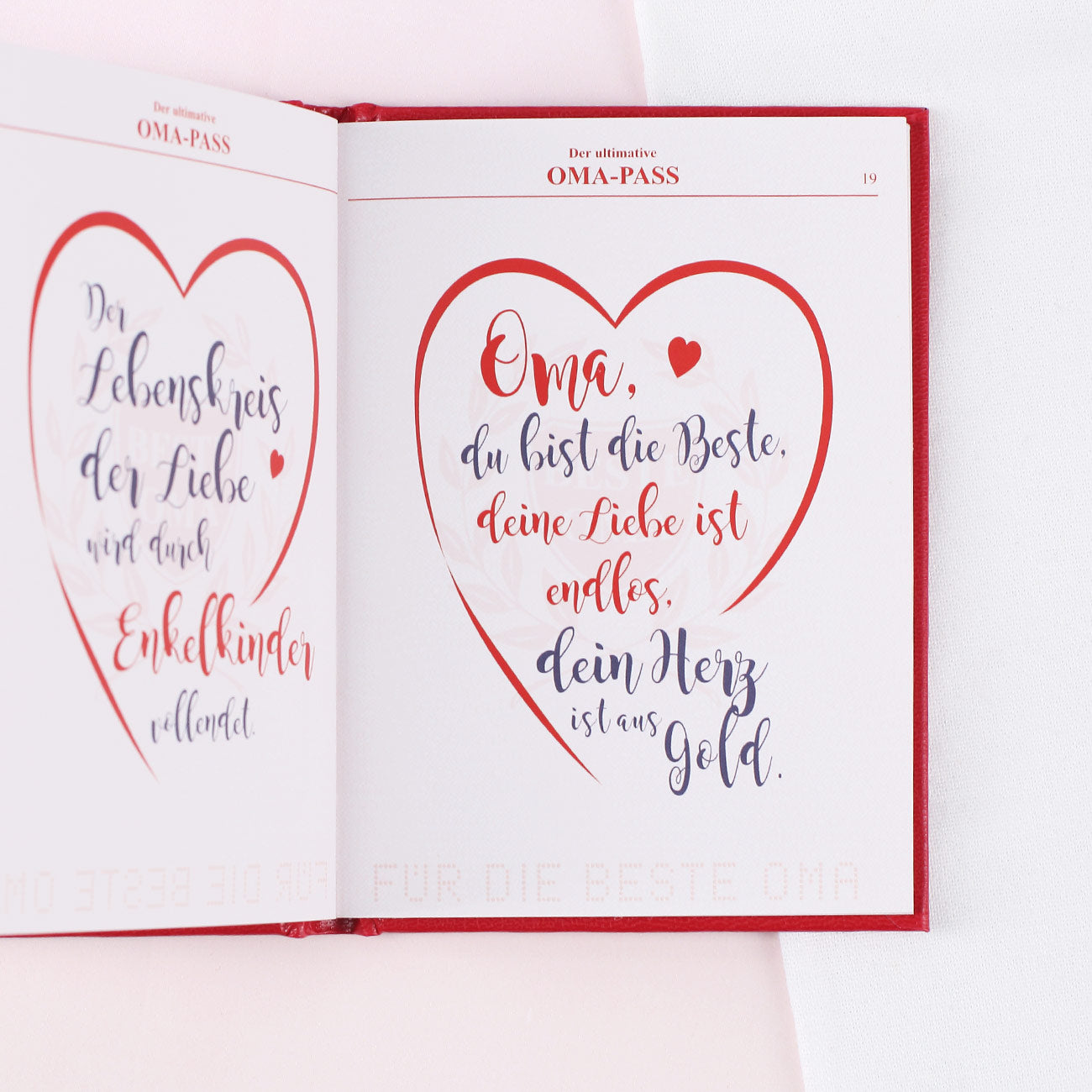 Dieser Oma-Pass ist kaum zu verwechseln mit einem echten Pass, wird auf der ersten Seite doch Name, Bild und Staatsangehörigkeit der Oma angegeben. Das in rotem Lederimitatumschlag gehaltene Buch hat aber noch mehr zu bieten: die 37 Seiten sind gefüllt mit farbigen Illustrationen, Weisheiten, Witzen und Anekdoten, die wohl nur eine Oma mit Enkeln verstehen kann.