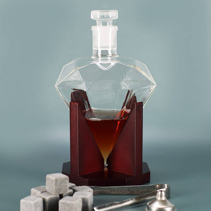 Für manche ist der Geschmack eines Whiskys oder Bourbons die höchste Stufe des Genusses. Damit dieser Genuss rundum abgestimmt ist, ist unser Diamond Decanter Set das perfekte Geschenk für Genießer. Enthalten ist in dem edlen Whisky Set eine Karaffe mit 850 ml Fassungsvolumen, die mit einer Kappe verschlossen wird, damit der Geschmack des Whiskys oder Bourbons optimal erhalten bleibt. Das kristallklare Glas ist dabei leicht und langlebig. Hinzu kommt ein Sockel aus wunderschöner roter Eiche, der sehr robust ist und die Flasche noch stylischer wirken lässt. So wird der Konsum des liebsten Whiskys und Bourbons besonders luxuriös und nobel!