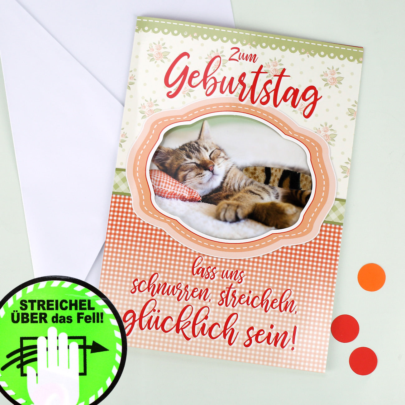 Diese Geburtstagskarte ist mehr als süß! Kuschelnd liegt die abgebildete Katze auf dem Sofa – und gibt ein hörbares Schnurren und Miauen von sich, sobald mit dem Finger zart über das Fell gestrichen wird. Dieser Spezialeffekt sorgt für extra große Augen bei kleinen und großen Katzenfans!