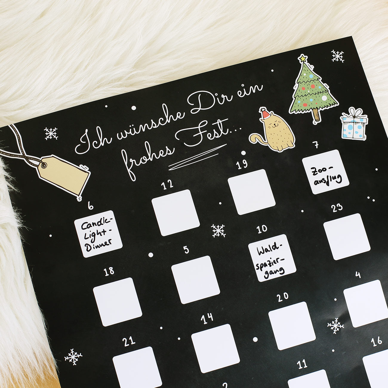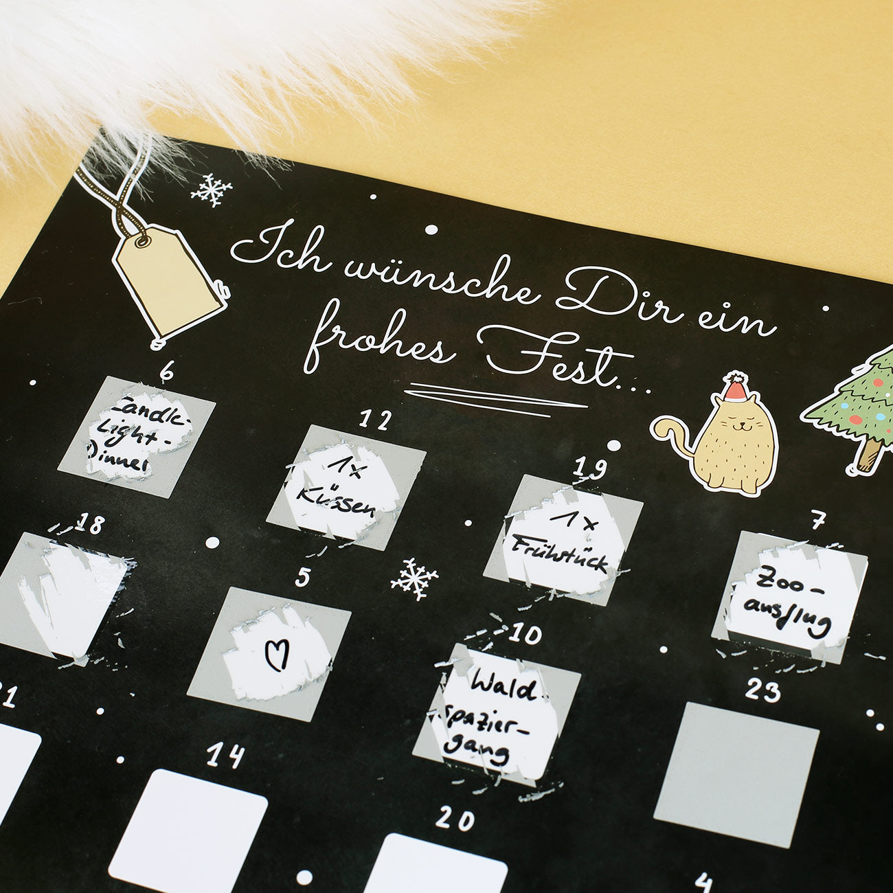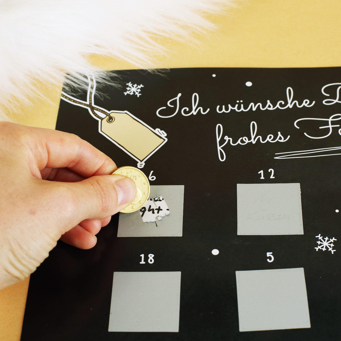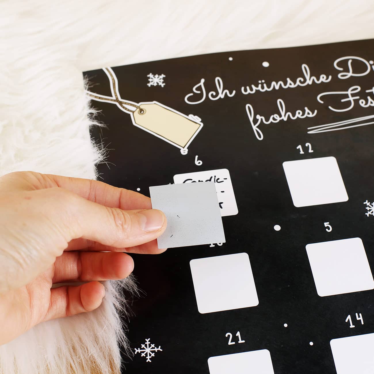 Es muss nicht immer ein großer oder auffälliger Adventskalender sein, um Ihre Liebsten glücklich zu machen! Mit diesem DIY Adventskalender in DIN A3 Größe können Sie selbstständig und ohne viel Aufwand ein personalisiertes Geschenk kreieren. Beschriften Sie die Felder mit kleinen Gefallen, Unternehmungen und lieben Worten, die die Adventszeit unvergesslich gestalten sollen. Dann können die Sticker mit der Oberfläche zum Freirubbeln über die Felder geklebt werden, Jeden Tag kann die beschenkte Person dann ein Feld freikratzen! Solch ein Adventskalender kommt unübersehlich von Herzen und wird die Vorweihnachtszeit erfolgreich versüßen.