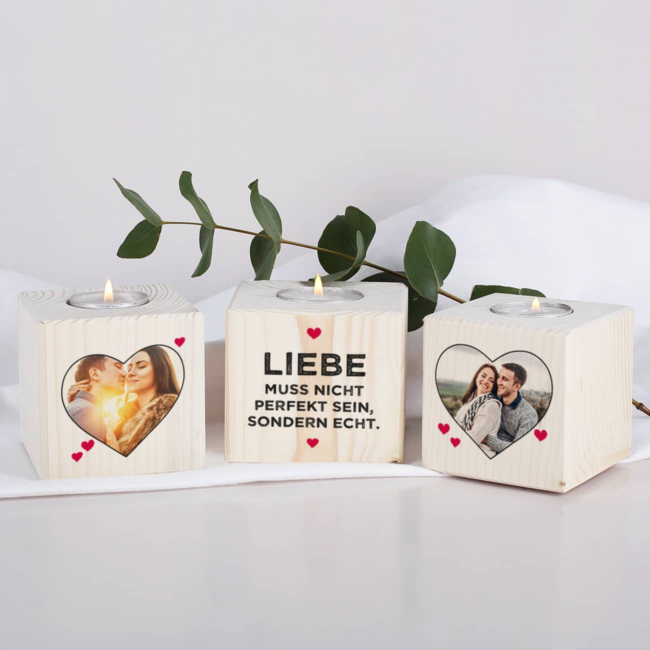 Drei Holzteelichter mit Fotoaufdruck - Liebe muss echt sein