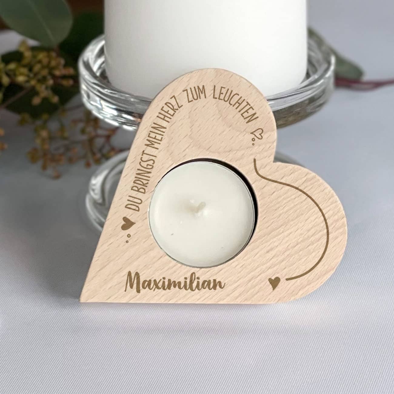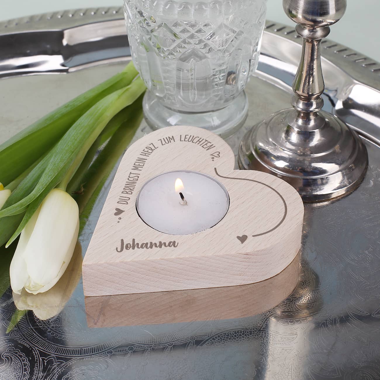 Überraschen Sie Ihren Liebsten oder Ihre Liebste mit einem Hauch von Romantik durch unseren gravierten Teelichthalter aus Holz in der bezaubernden Herzform. Dieses liebevoll gestaltete Geschenk, perfekt für den Valentinstag oder andere besondere Anlässe, trägt die Gravur "Du bringst mein Herz zum Leuchten" und kann zusätzlich mit einem persönlichen Text nach Ihrem Wunsch, wie beispielsweise den Namen des Paares, individualisiert werden. Der gravierte Teelichthalter besteht aus unbehandeltem Hartholz und verleiht Ihrem Zuhause eine warme und persönliche Atmosphäre. Das Licht des Teelichts, kombiniert mit der romantischen Gravur, macht dieses Geschenk zu einer liebevollen Geste, die Herzen zum Leuchten bringt.
