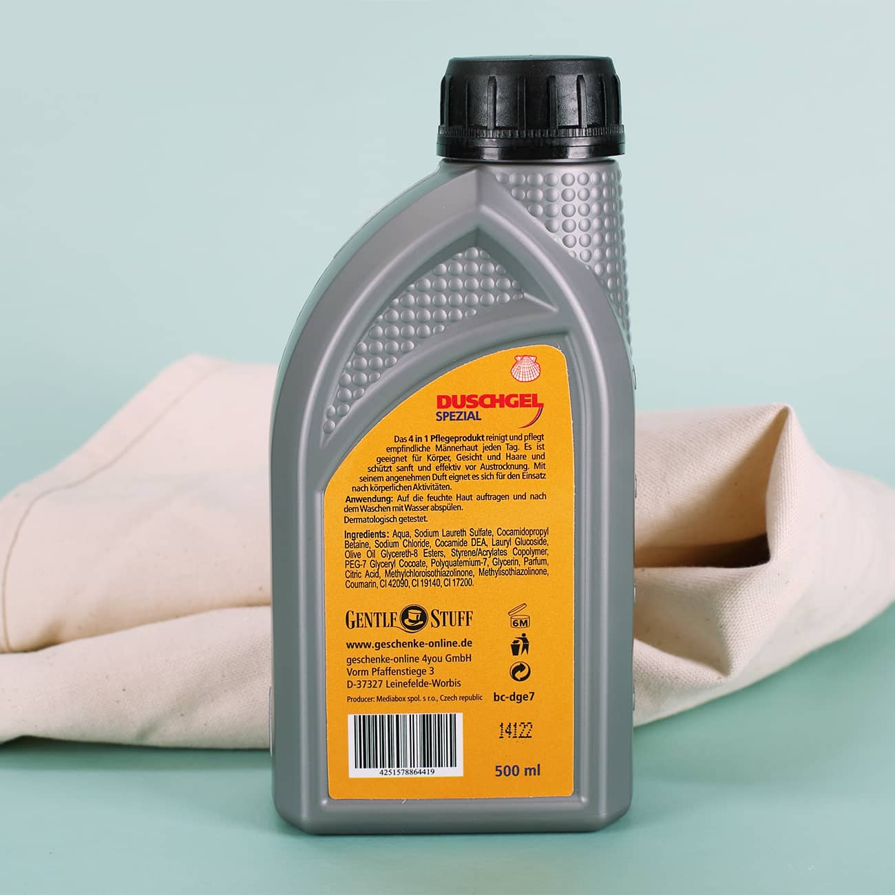 Das Duschgel Spezial ist nicht nur sehr pflegend, vitalisierend und wohlduftend, sondern ist auch in eine raffinierte Verpackung gefüllt. Diese sieht aus wie die typischen Verpackungen von Reinigungsmitteln, die man in der Tankstelle für das Auto, das Motorrad und andere Fahrzeuge findet. Der Kanister beinhaltet 500ml von dem regenerierenden Duschgel, das jeder Mann gerne verwenden wird. Mit Olivenöl angereichert wird dieses 4 in 1 Pflegeprodukt zuverlässig Haut und Haare reinigen und pflegen. Überreichen Sie diese Duschpflege für Männer zu jedem erdenklichen Anlass, beispielsweise als Vatertagsgeschenk, Geburtstagsgeschenk oder auch Geschenk zum Junggesellenabschied.