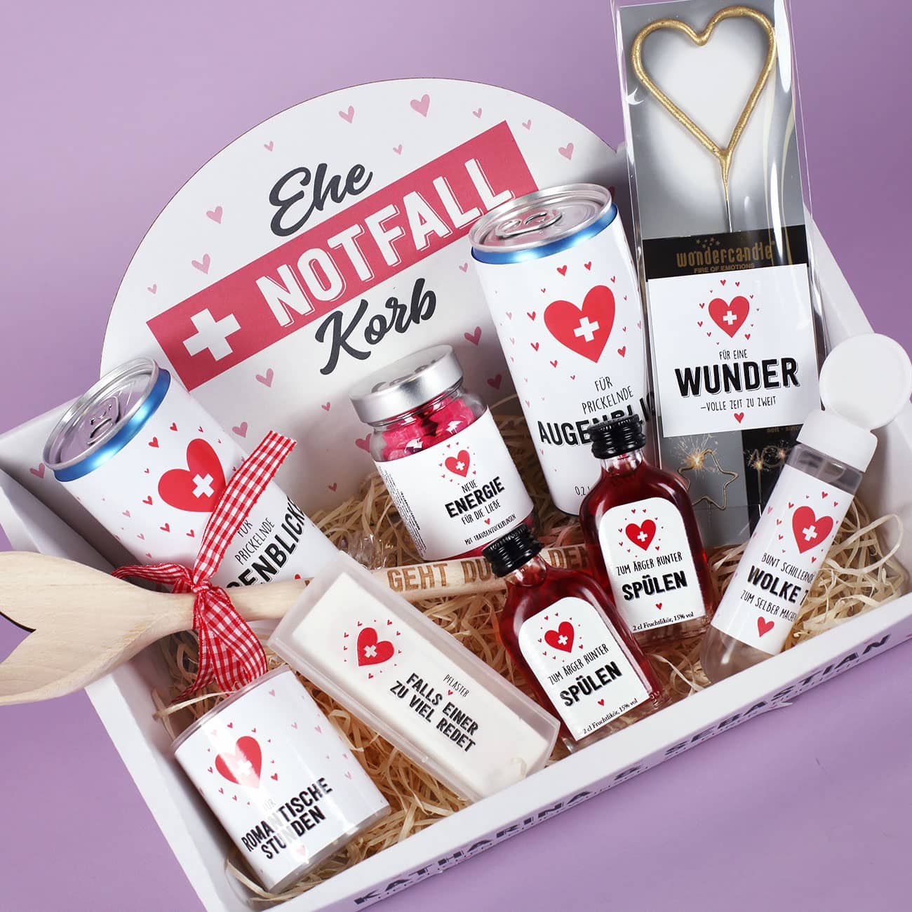 Individueller Geschenkkorb mit lustiger Füllung für Ehe-Notfälle
