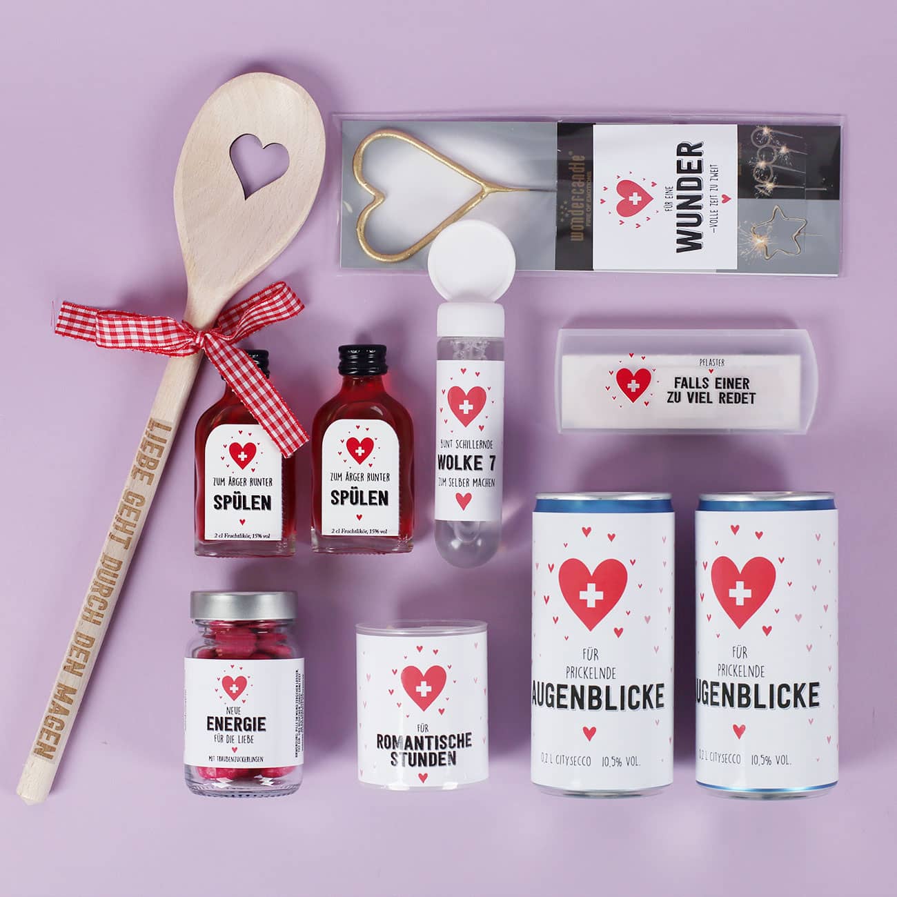 Der Geschenkkorb enthält eine vielfältige Auswahl an Produkten für jede Situation, die in der Ehe auftreten kann. Zwei Secco Dosen sorgen für einen spritzigen Genuss, während zwei Flaschen Kräuterlikör oder Fruchtlikör für entspannte Momente sorgen. Ein dekorativer Kochlöffel aus Buchenholz mit Gravur und eine Packung Seifenblasen verleihen dem Geschenkkorb eine spielerische Note. Ein Teelicht, Pflaster, eine Wunderkerze in Herzform und Traubenzuckerpillen runden das Sortiment ab und bieten eine unterhaltsame Auswahl für das Brautpaar. Solch ein Geschenkset zur Hochzeit wird garantiert für strahlende Gesichter sorgen!