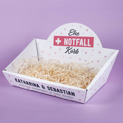 Suchen Sie nach einer originellen Geschenkidee für eine Hochzeit? Unser individueller Geschenkkorb mit lustiger Füllung für Ehe-Notfälle ist die perfekte Wahl! Der Geschenkkorb wird mit zwei Zeilen Text nach Ihren Wünschen personalisiert, sodass Sie ihn ganz individuell gestalten können. Sie haben auch die Möglichkeit, den Geschenkkorb ohne Inhalt zu bestellen. Unsere witzige Geschenkidee zur Hochzeit ist nicht nur individuell bedruckt, sondern auch eine unterhaltsame und originelle Überraschung für das glückliche Paar. Freuen Sie sich auf schnelle Lieferung und eine hochwertige Zusammenstellung, die garantiert für viel Gelächter sorgen wird!