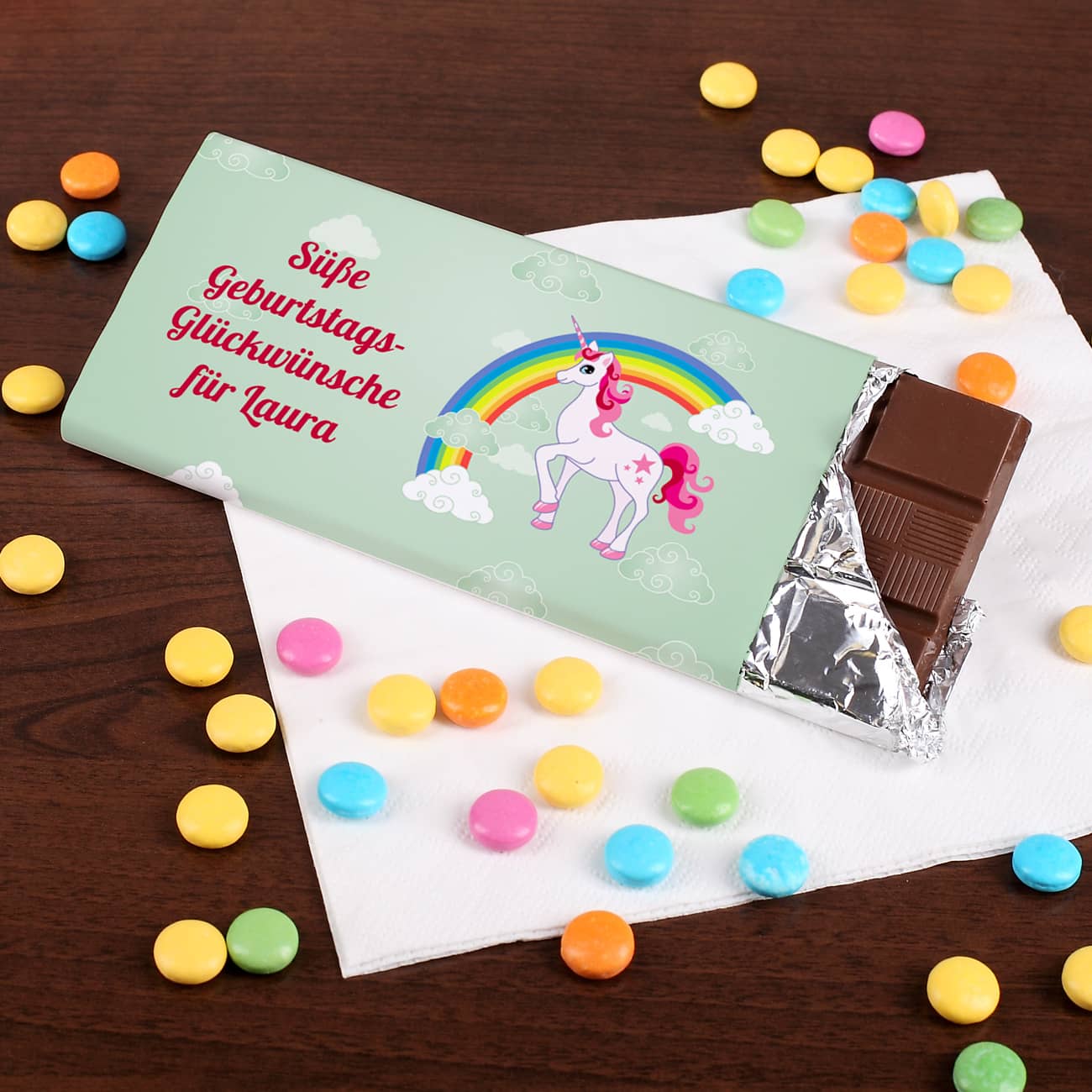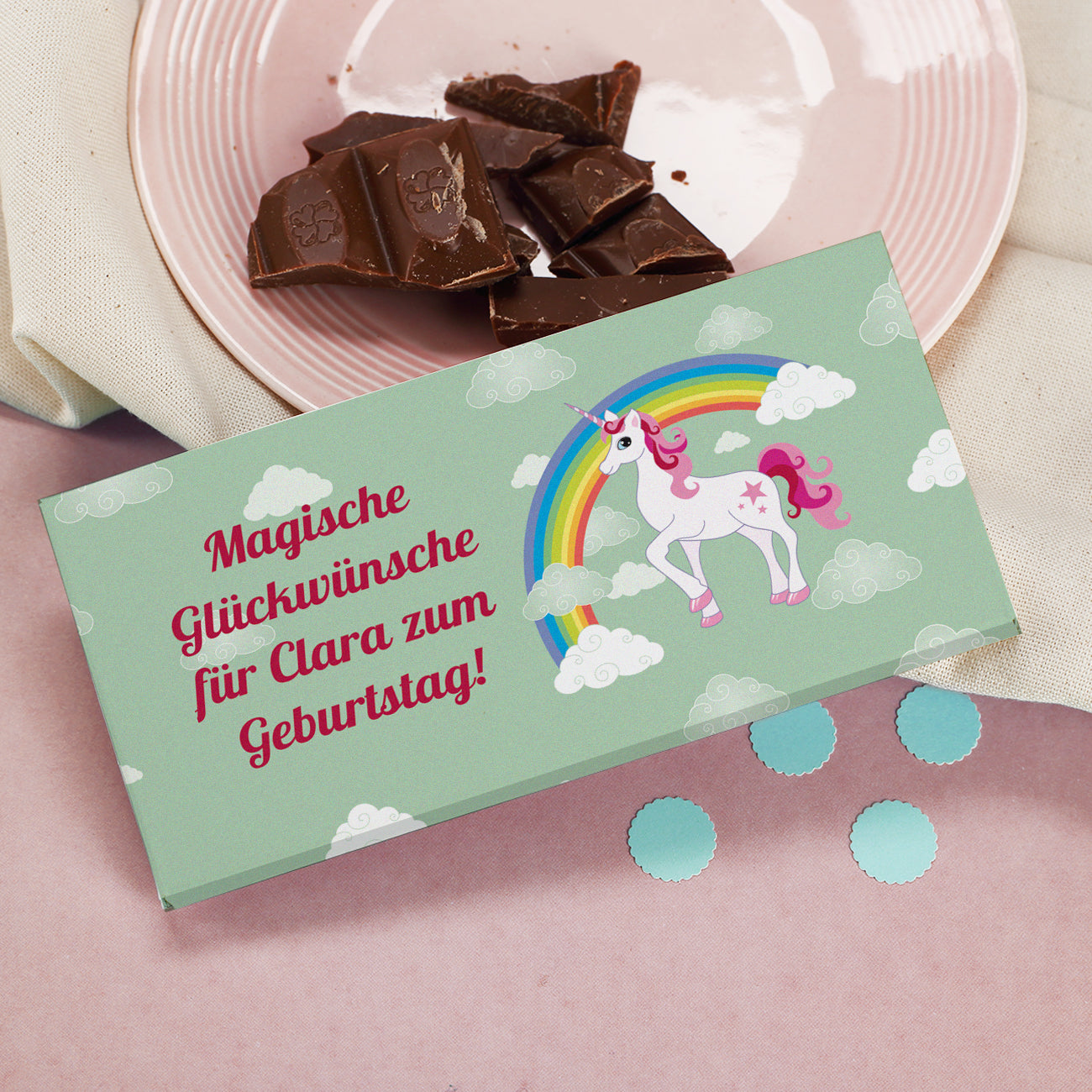 Überraschen Sie Naschkatzen zum Geburtstag, zu Ostern oder einem anderen passenden Anlass mit dieser leckeren Einhorn-Schokolade und übermitteln Sie gleichzeitig liebe Wünsche. Mit diesen süßen Grüßen in Form von personalisierter Schokolade begeistern Sie kleine und große Mädchen garantiert.