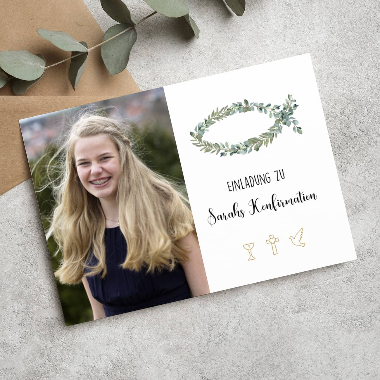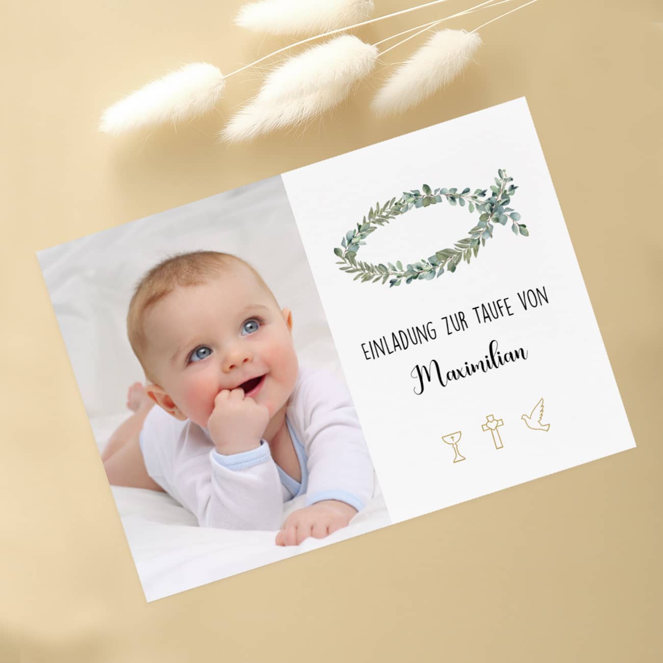 Versenden Sie liebevolle Einladungen zu Ihren christlichen Anlässen mit unserer einzigartigen Einladungskarte mit Fisch aus Eukalyptus als Motiv! Diese Karte ist nicht nur eine liebevolle Einladung, sondern auch ein bleibendes Erinnerungsstück für Ihre Gäste. Unsere Einladungskarte wird beidseitig bedruckt und zeigt ein wunderschönes Eukalyptusmotiv mit einem symbolischen Fisch, der für christliche Symbole steht. Das Besondere an dieser Karte Taufe, Kommunion, Konfirmation ist die Möglichkeit der Individualisierung: Fügen Sie ein Foto Ihrer Wahl ein und passen Sie mehrere Textfelder nach Ihren Wünschen an, um eine persönliche Botschaft zu übermitteln.