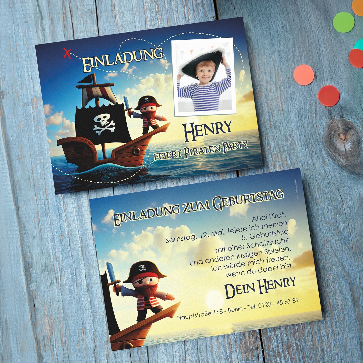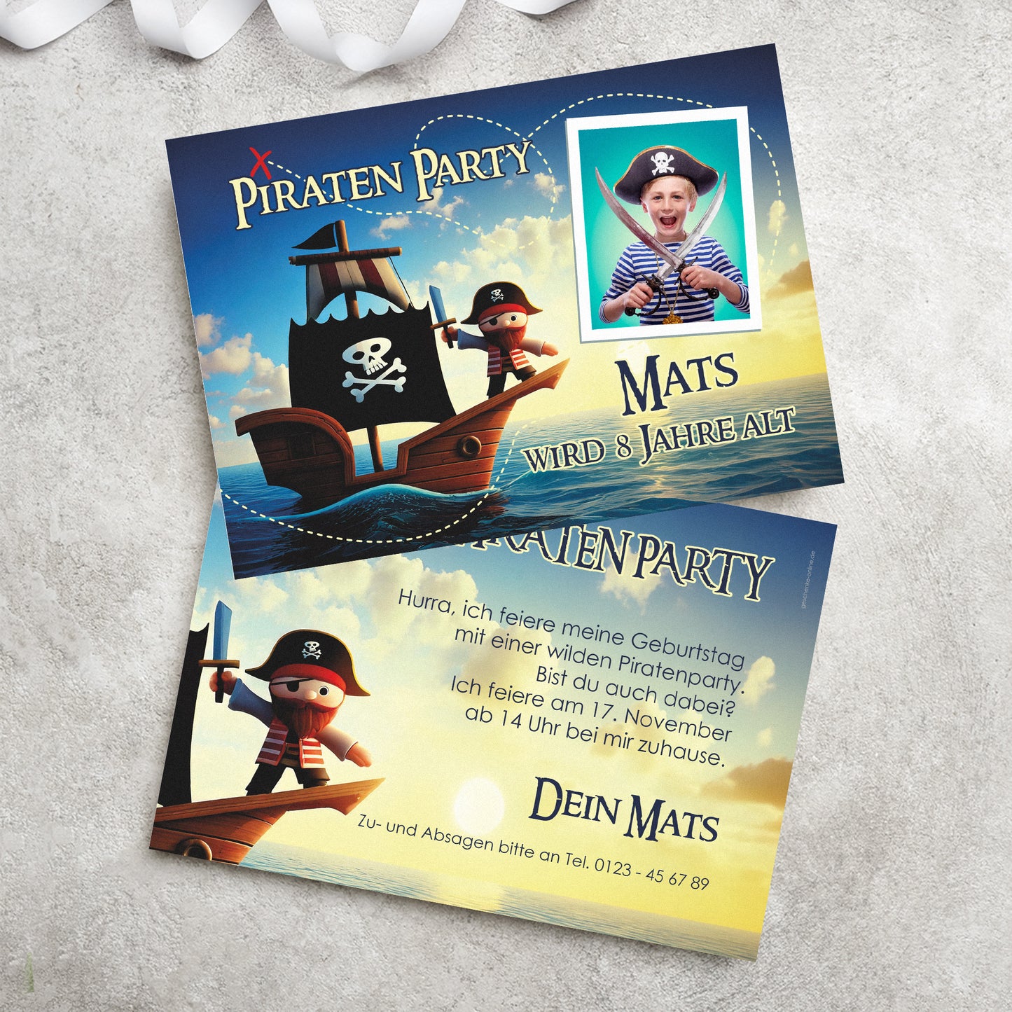Einladungskarte zum Kindergeburtstag mit Piratenmotiv und Foto