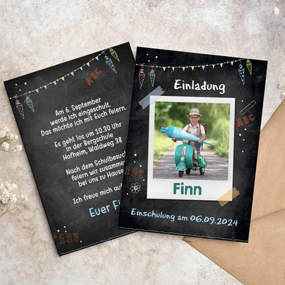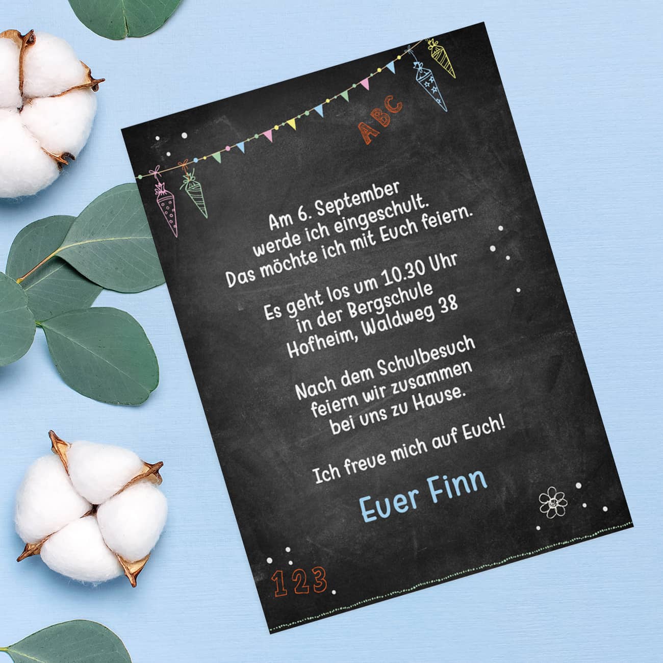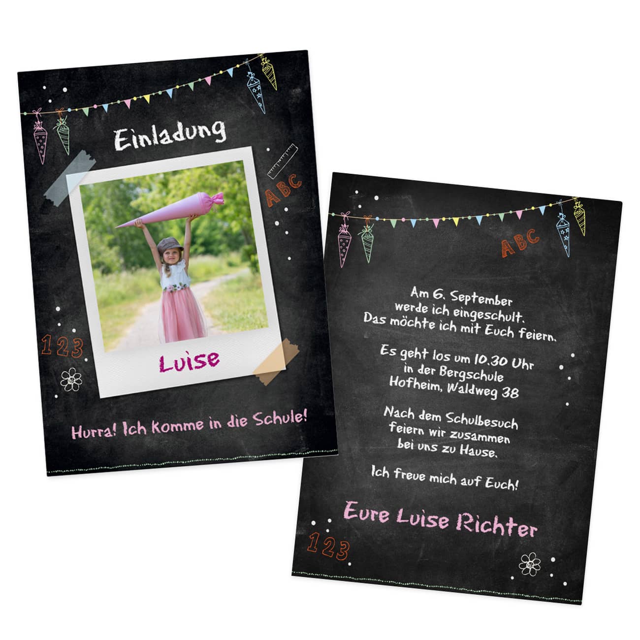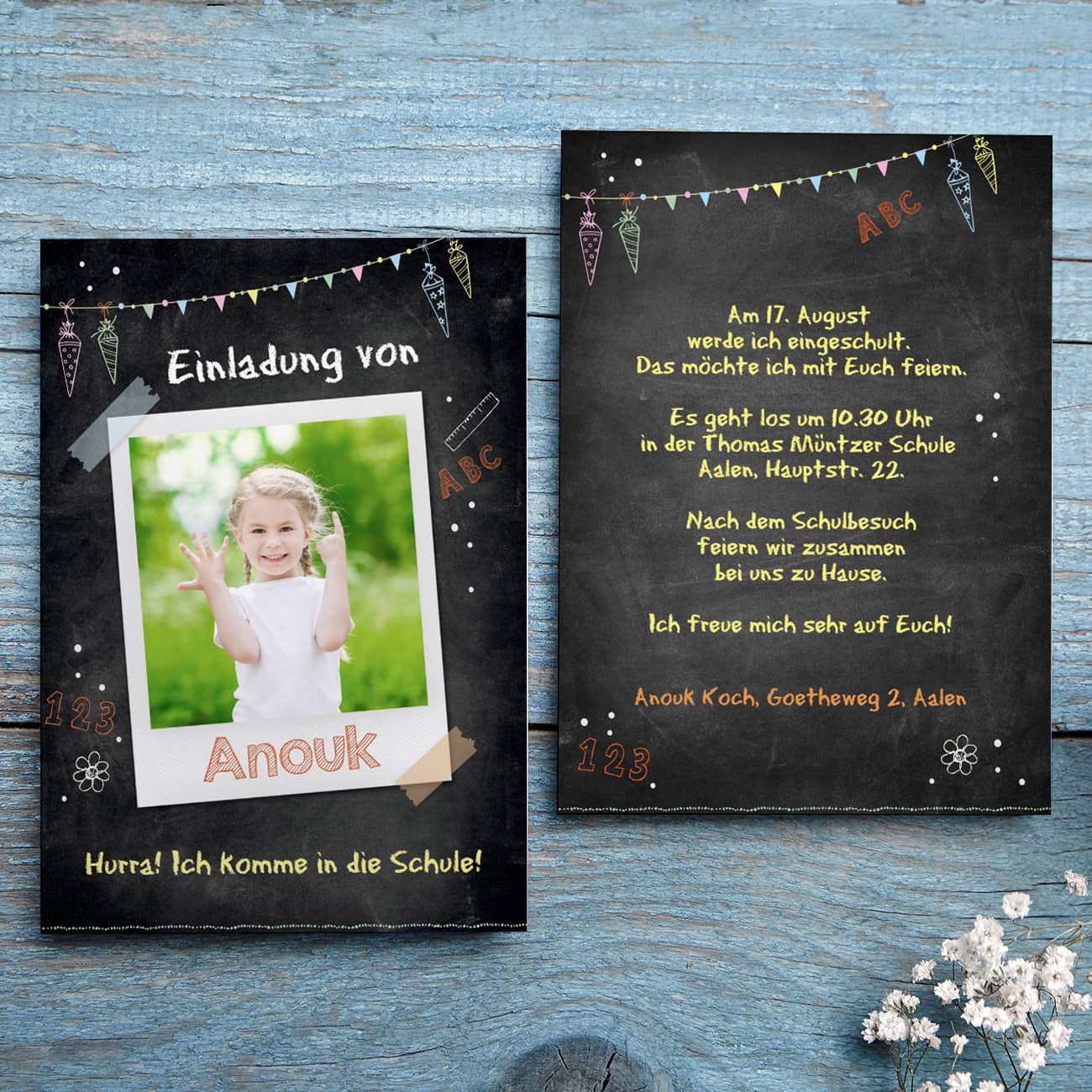 Das praktische Postkartenformat ermöglicht es die Einladungen einfach und kostengünstig per Post zu versenden. So können Sie Ihre Gäste stilvoll, persönlich und schnell zu der kommenden Veranstaltung einladen und den Tag der Einschulung zuverlässig und unvergesslich für alle Beteiligten gestalten! Durch das Foto wird die Einladungskarte noch lange als schöne Erinnerung dienen.