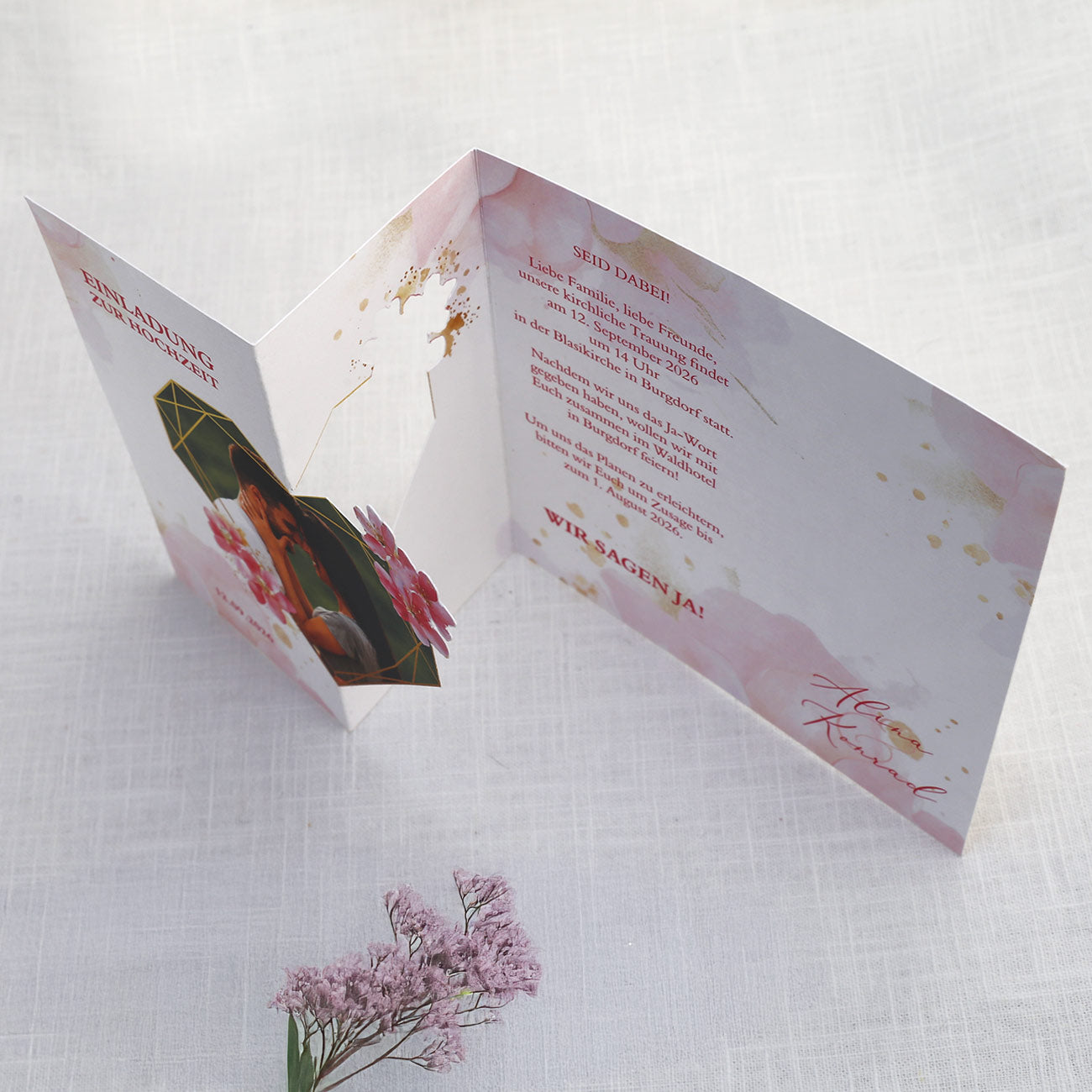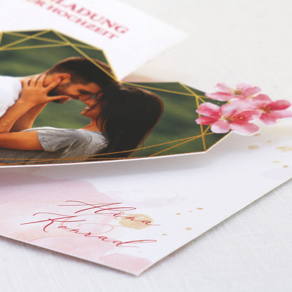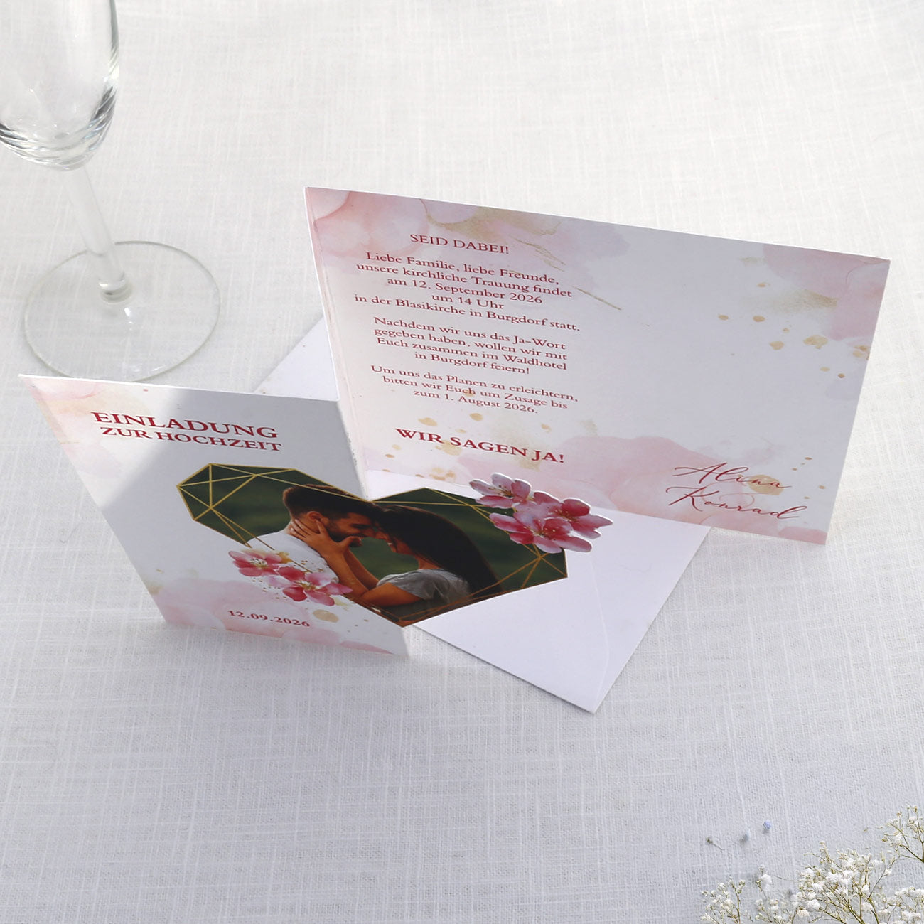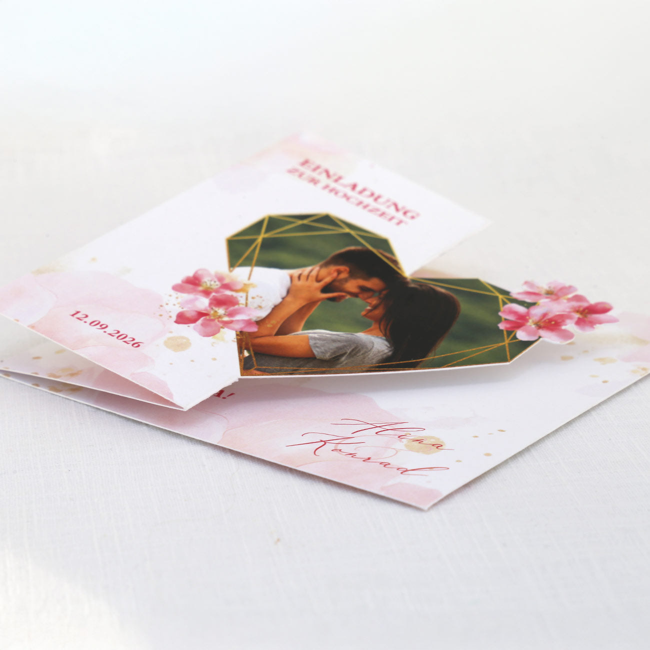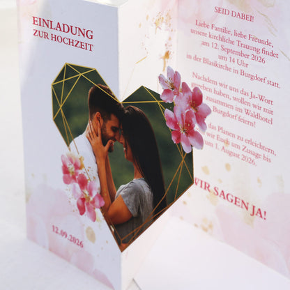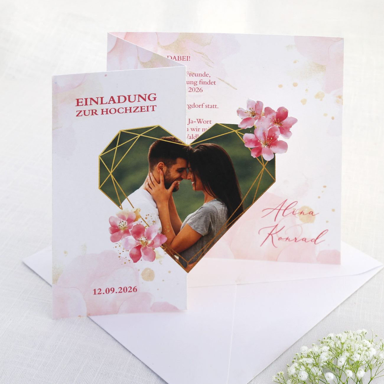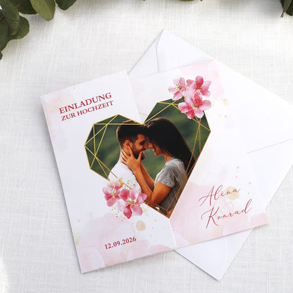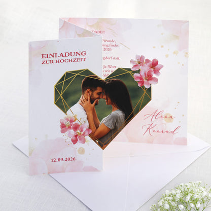 Einladungskarte zur Hochzeit - Faltkarte mit Foto im Blüten-Herz