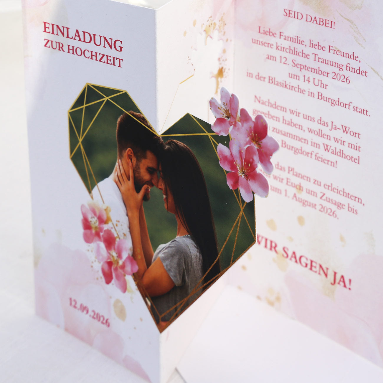Beeindrucken Sie Ihre Gäste mit dieser liebevoll gestalteten Hochzeitseinladung! Die effektvolle Faltkarte besticht durch ihr modernes Design und das romantische Herzmotiv auf der Frontseite, das mit zarten Blüten geschmückt ist. Ein persönliches Foto im Herz macht die Karte besonders individuell. Beim Öffnen der Karte klappt das Herz stilvoll nach außen und sorgt für einen besonderen Wow-Effekt.