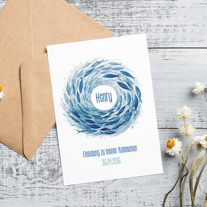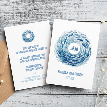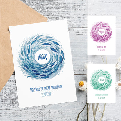 Einladungskarte zur Konfirmation, Kommunion, Taufe mit Wunschdaten | Fische Ichthys