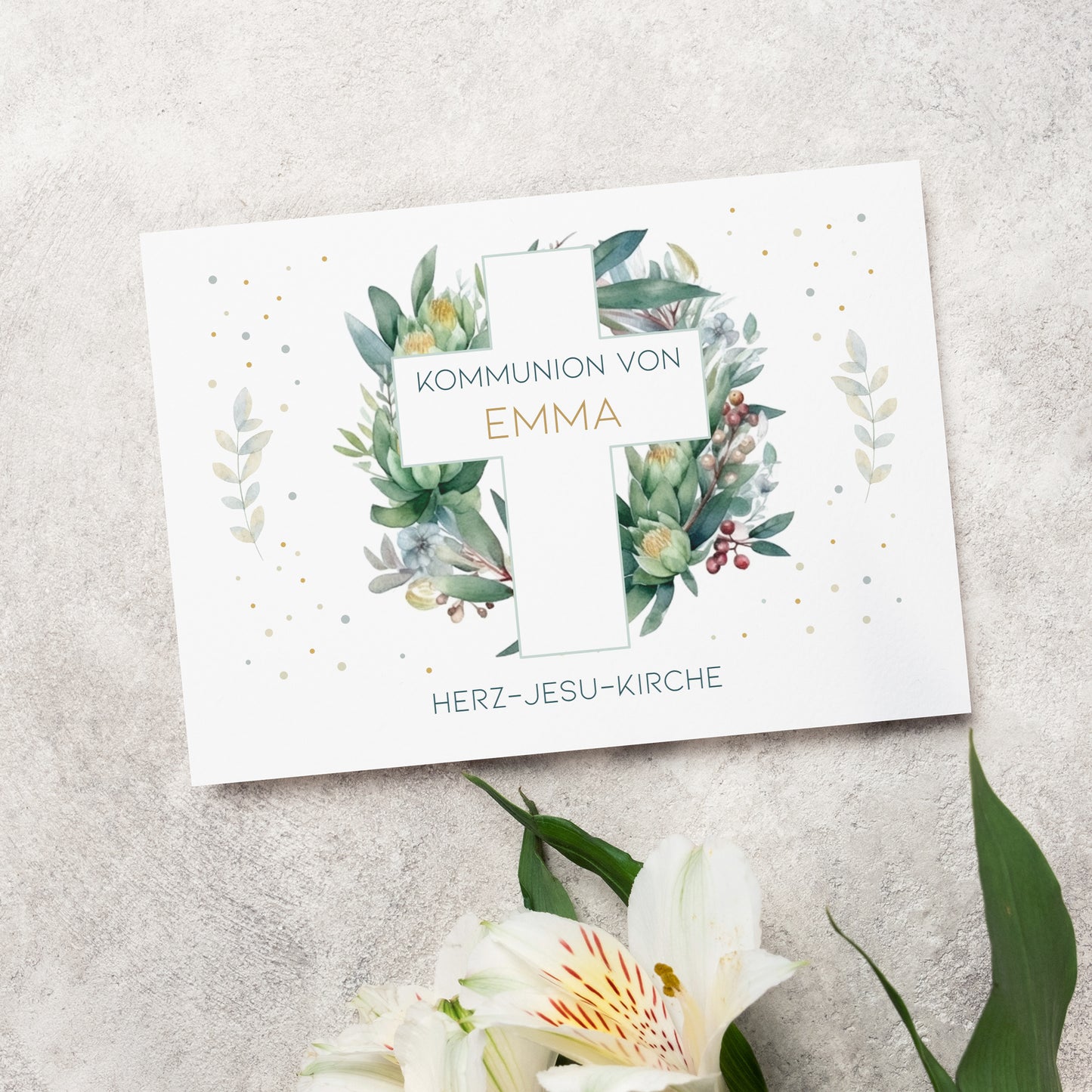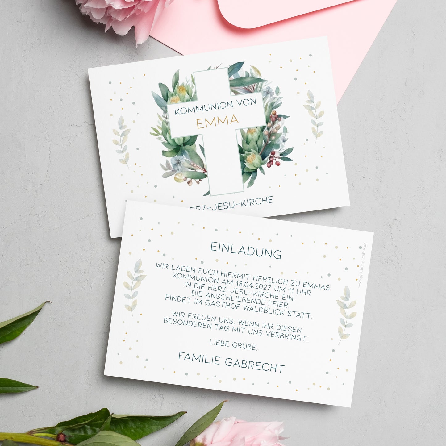 Einladungskarte zur Konfirmation, Kommunion, Taufe mit Wunschdaten | Kreuz & Blätterkranz
