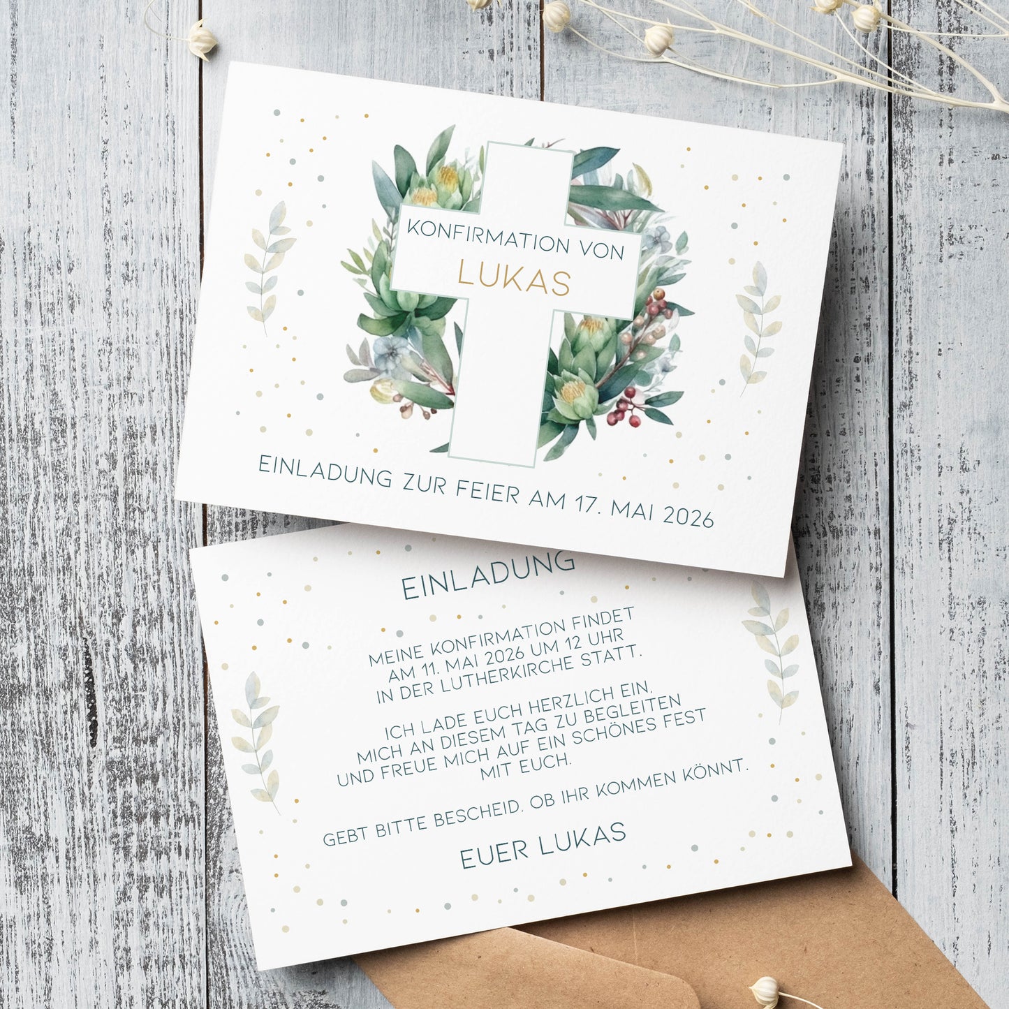 Diese elegante Einladungskarte mit christlichem Kreuz und einem stilvollen Kranz aus Blättern ist die perfekte Wahl für feierliche Anlässe wie Konfirmation, Kommunion oder Taufe. Die sanften Grüntöne verleihen ihr eine edle Optik, die sich harmonisch in jede Feier einfügt.