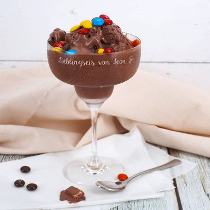 Der Eisbecher aus Glas wird mit dem Spruch "Lieblingseis von", Ihrem Wunschnamen und einem kleinen Eistüten-Symbol graviert. So steht dann z.B. auf dem Glas "Lieblingseis von Anna" oder "Lieblingseis von Manuel". Die Gravur befindet sich nur auf einer Seite des Glases.