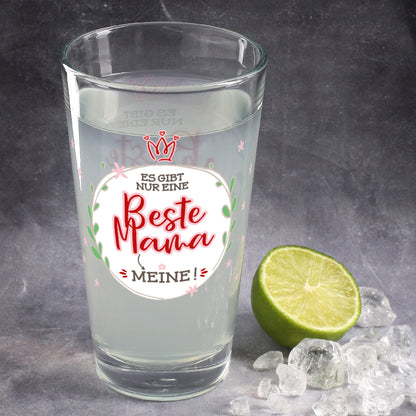 Dieses hochwertige Trinkglas ist eine super Geschenkidee! Sei es zum Muttertag, Geburtstag, zu Ostern oder als kleines Dankeschön zwischendurch - Ihre Mama wird sich garantiert über so eine liebevolle Aufmerksamkeit freuen. Auf beiden Seiten trägt das Glas den Aufdruck Es gibt nur eine beste Mama. Meine! Umgeben ist dieser Text von einem Blätterkranz und einigen kleinen Blüten in zartem Rosa.
