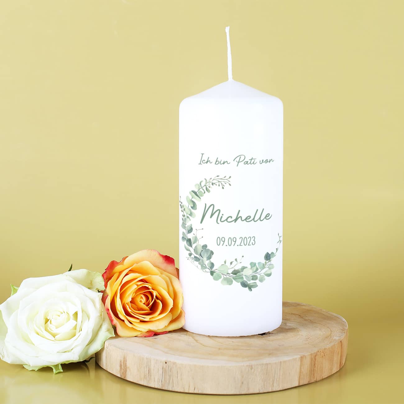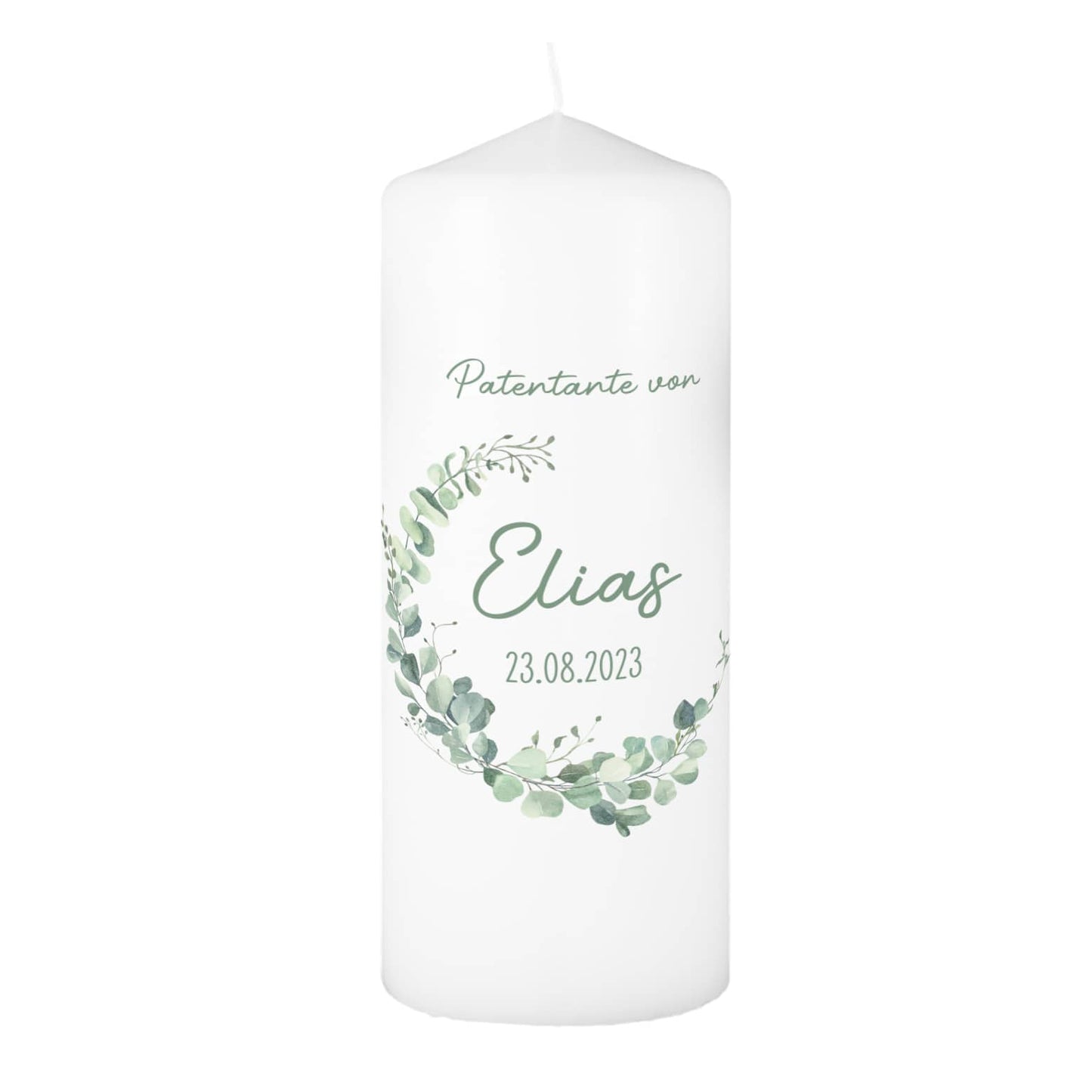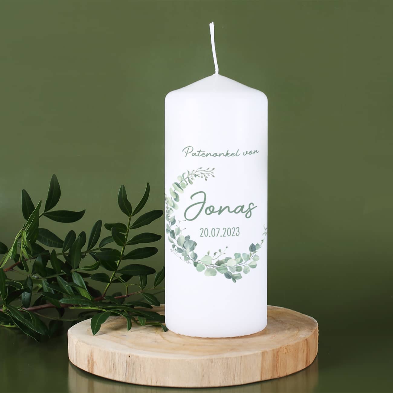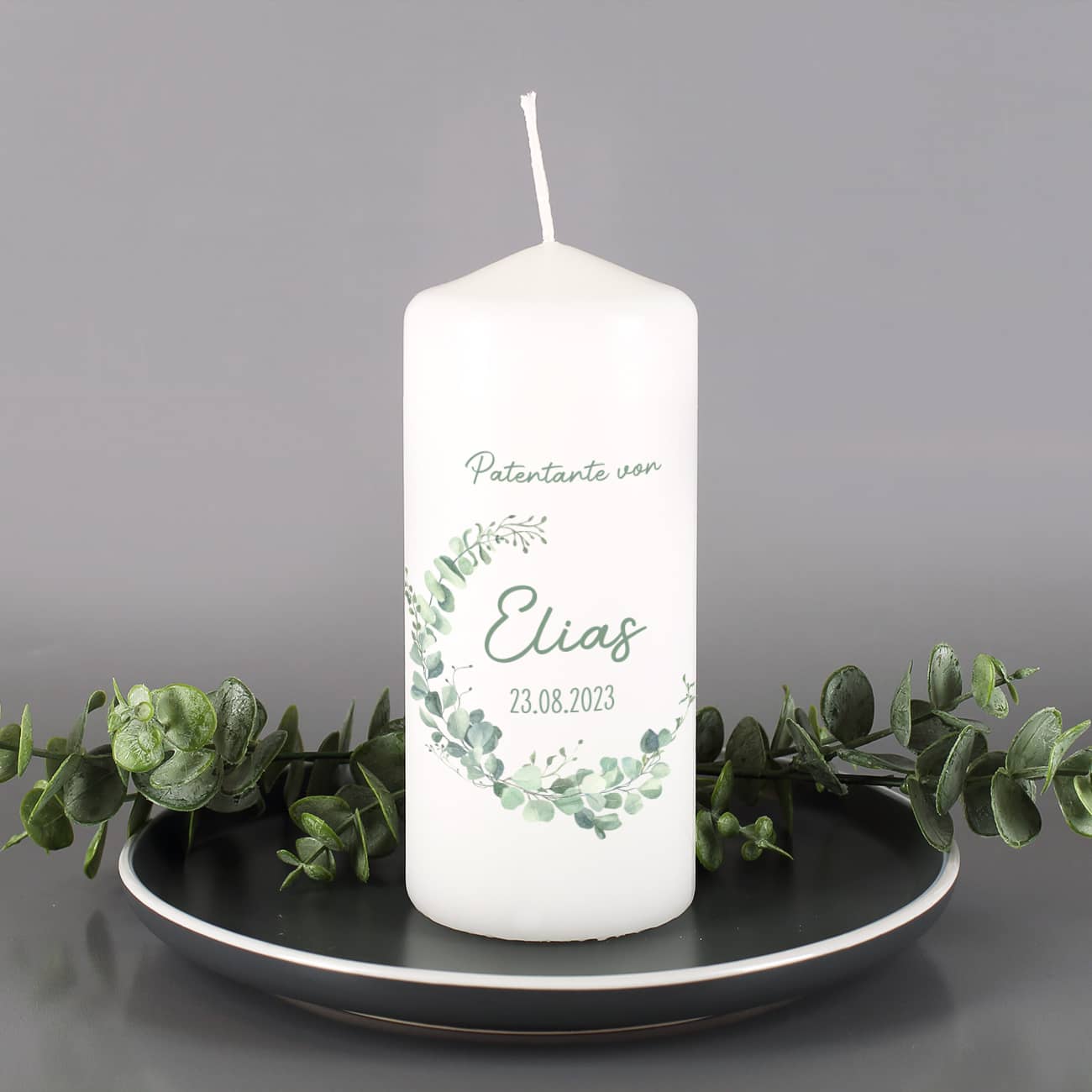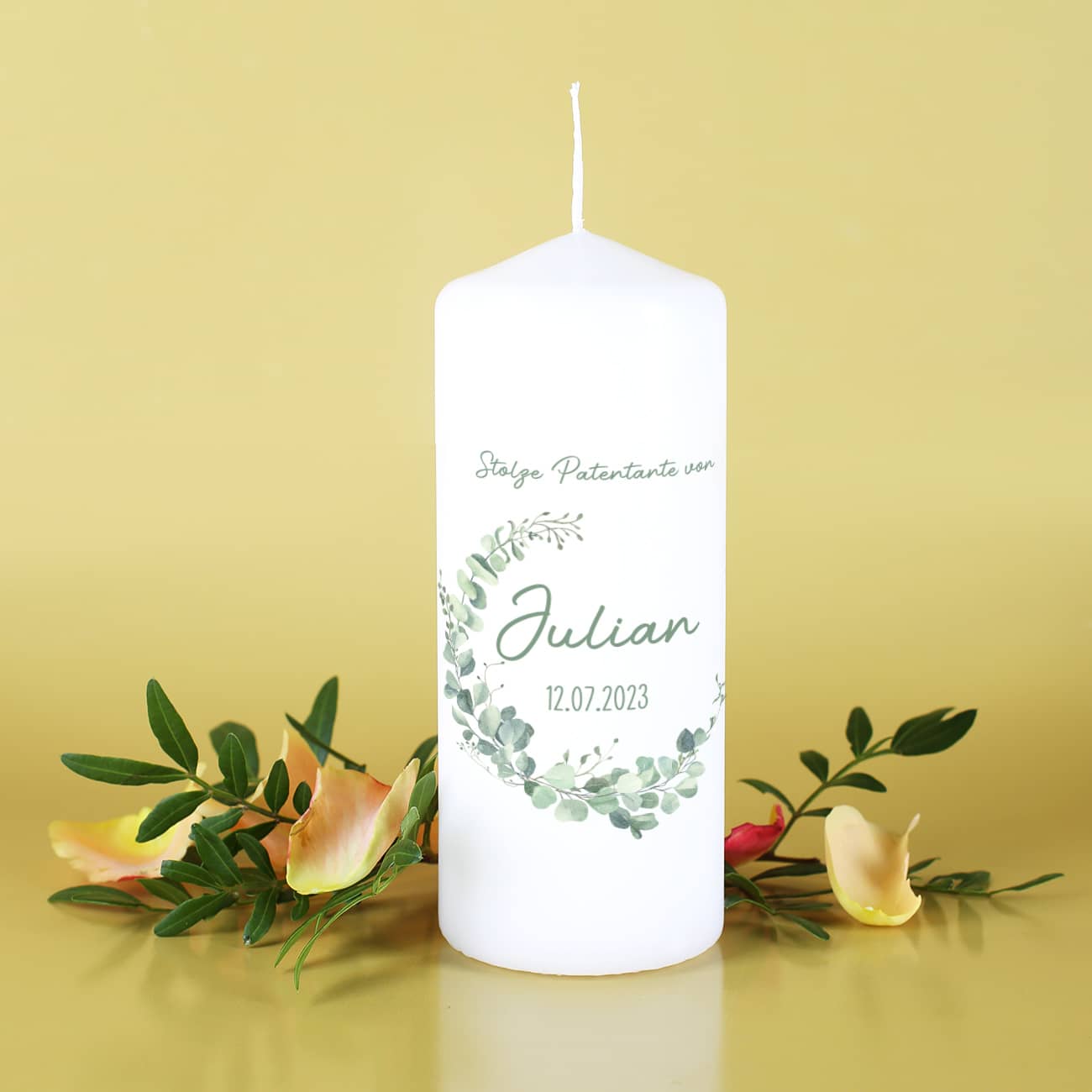 Eukalyptus Patenkerze zur Taufe personalisiert
