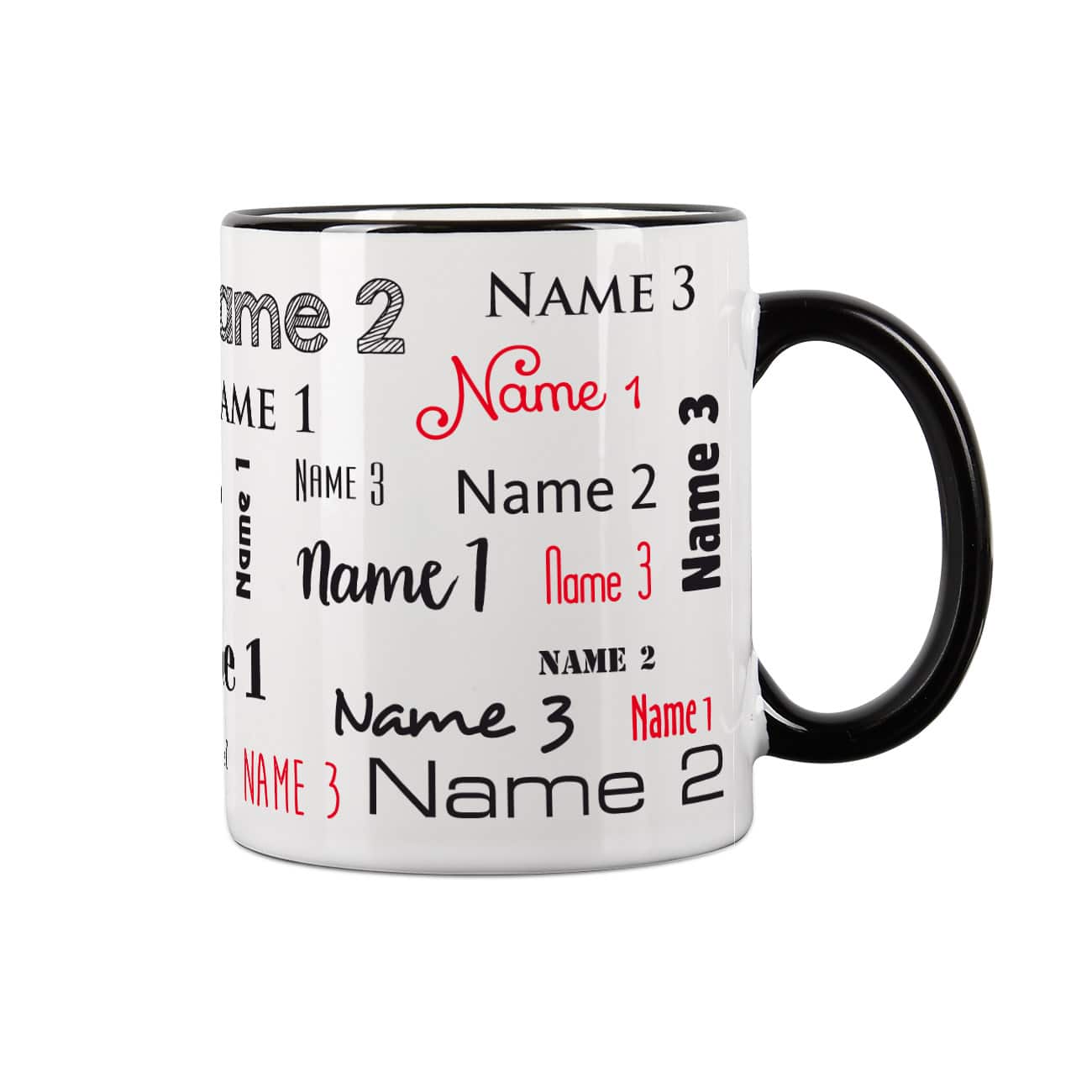 Eine tolle Tasse, von der die ganze (dreiköpfige) Familie etwas hat! Die Keramiktasse mit schwarzem Rand und Henkel wird mit Ihren drei Wunschnamen zu einer bezaubernden Geschenkidee für die Kleinfamilie. Sie sorgt für noch mehr Freude am morgendlichen Frühstückstisch und ist darüber hinaus auch ein praktisches Geschenk fürs Büro.