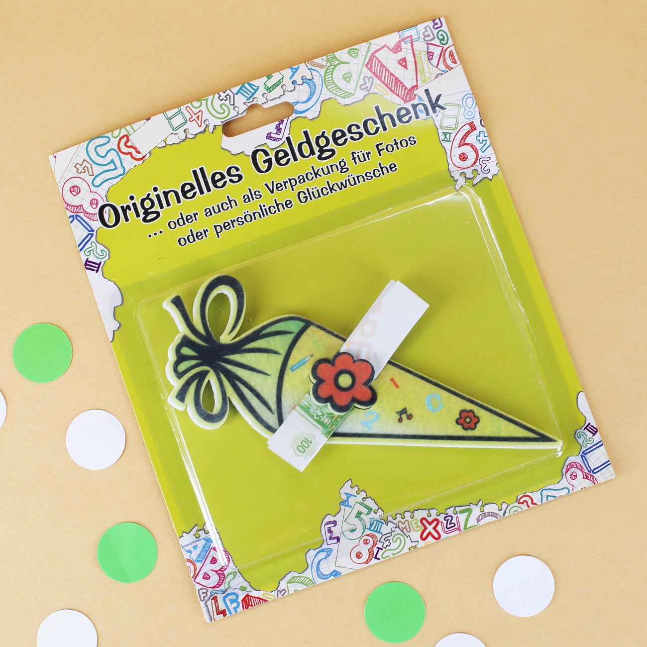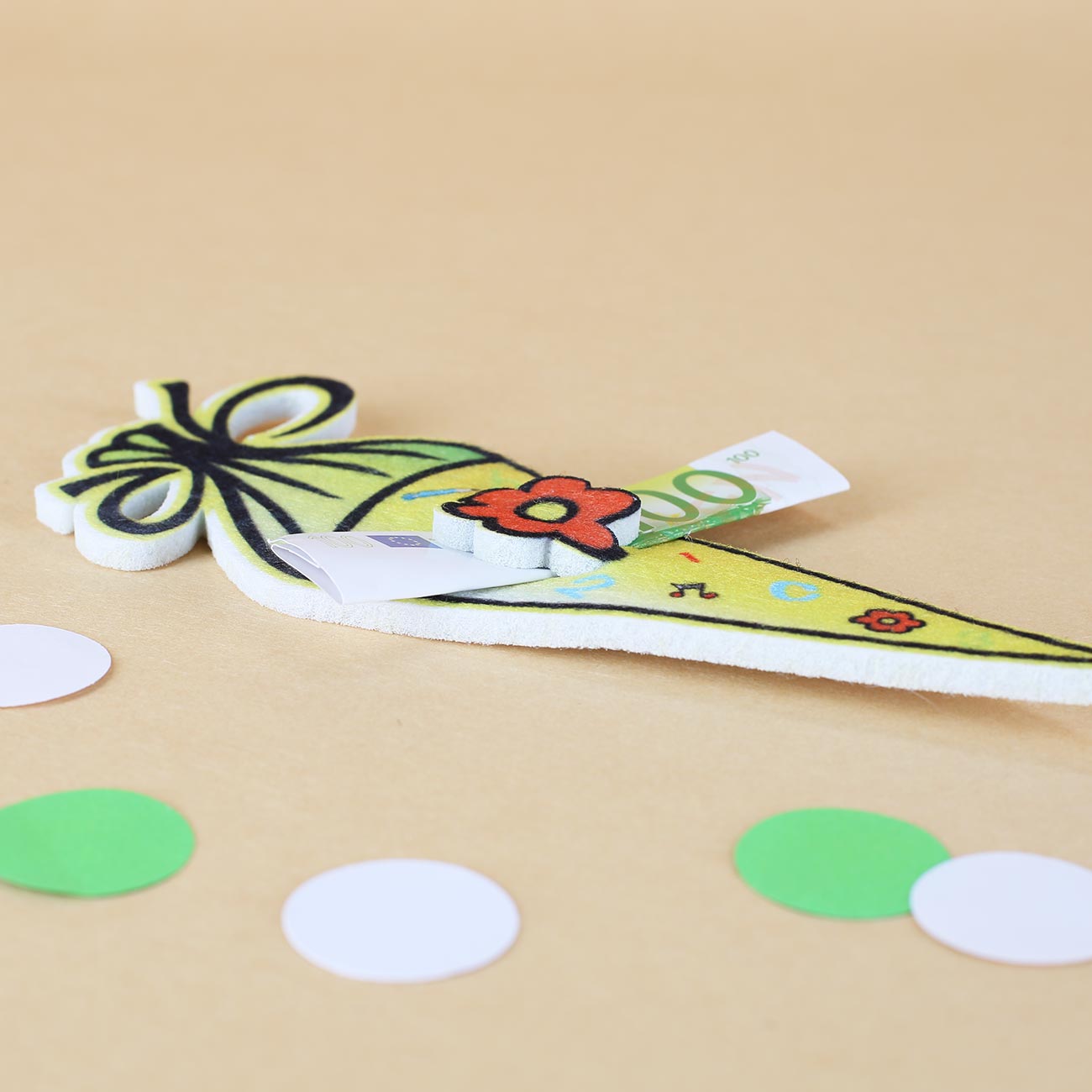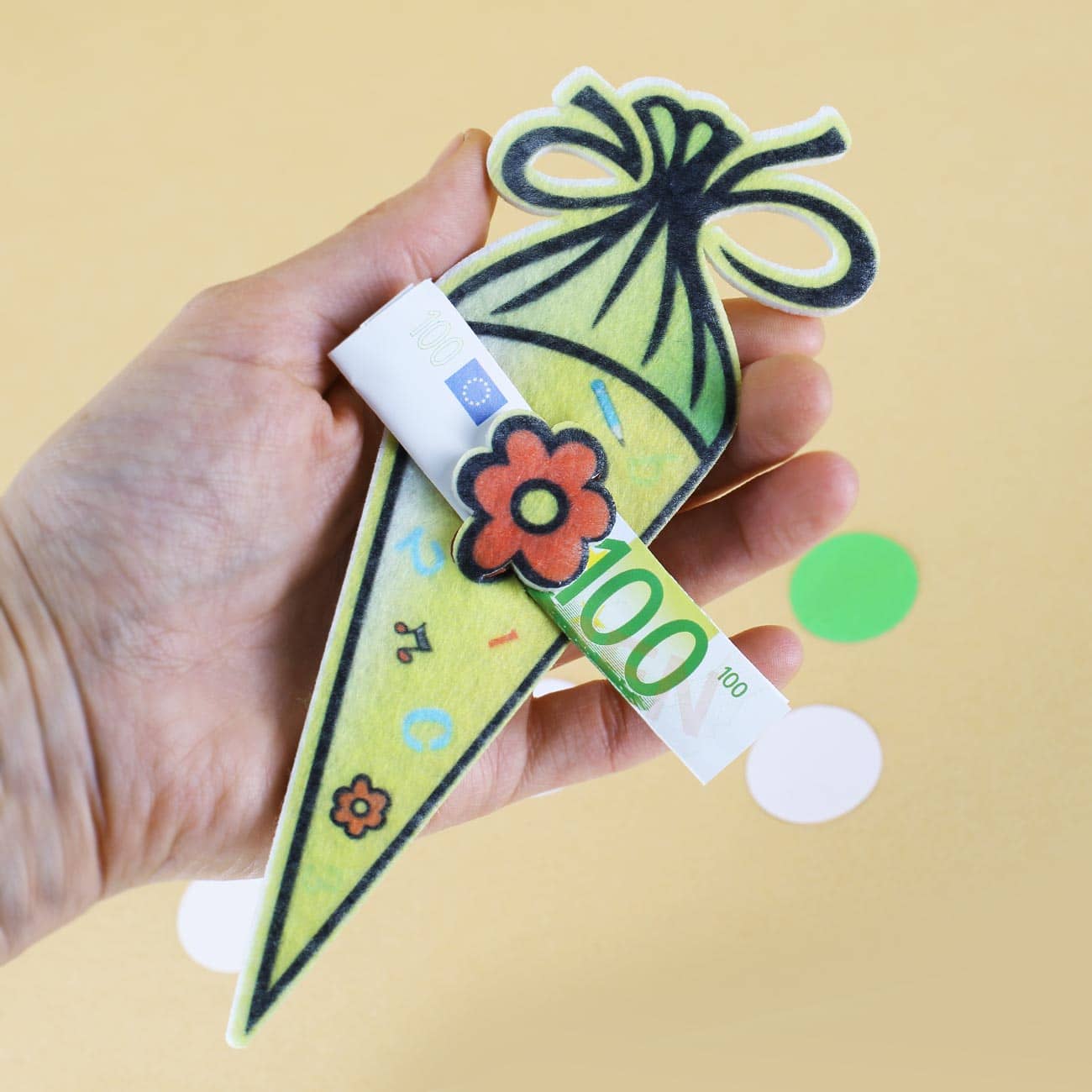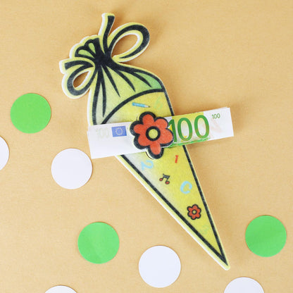 Überreichen Sie ein Geldgeschenk, einen Gutschein oder Glückwünsche mit dieser kleinen Schultüte aus Filz zur Einschulung. Sie besitzt einen Schlitz, in welchen Sie Ihr Geldgeschenk einstecken können. So können Sie Ihr Geldgeschenk zur Einschulung originell, aber dennoch kompakt verpacken.