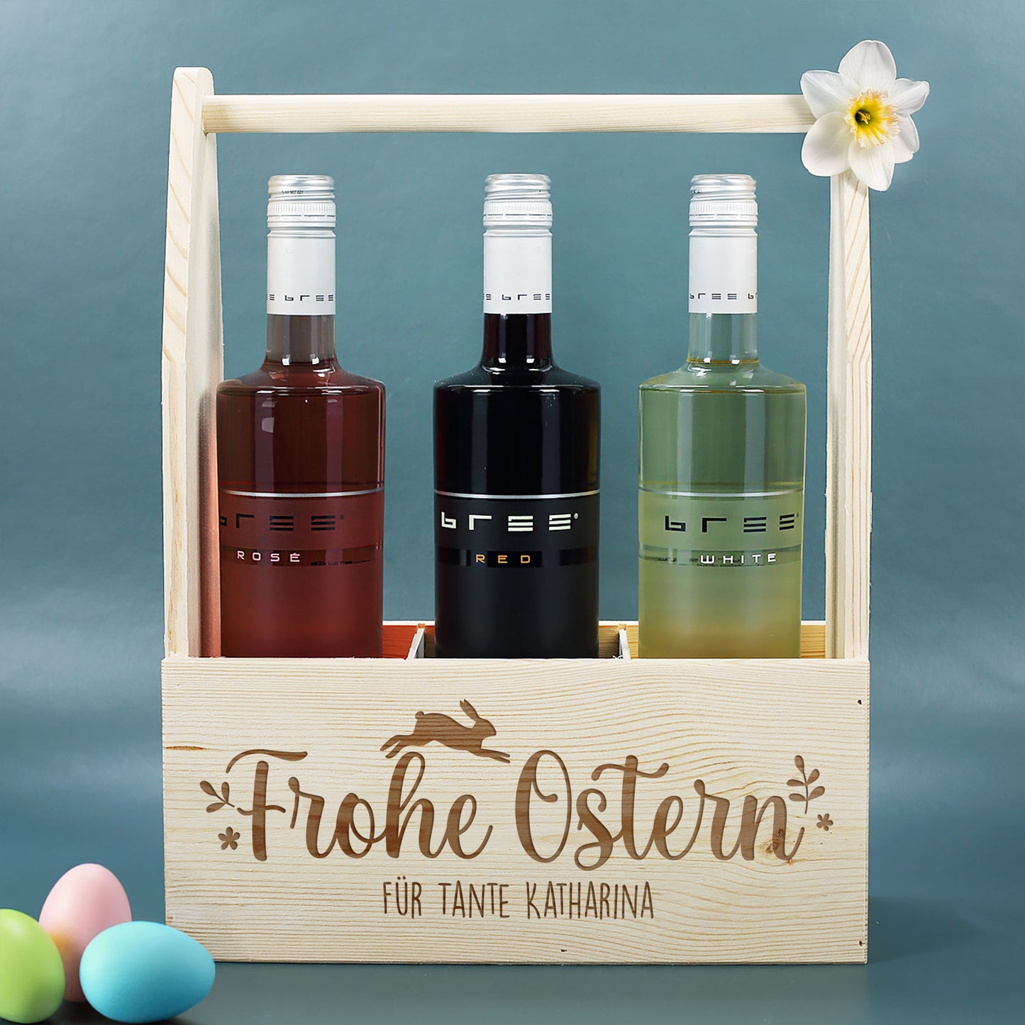 Dieser gravierte Flaschenträger bietet Platz für drei Flaschen und eignet sich ideal als individuelles Ostergeschenk. Füllen Sie ihn mit den Lieblingsgetränken Ihrer Familie oder Freunde und überreichen Sie ein Geschenk, das nicht nur an Ostern, sondern auch danach noch lange Freude bereitet.