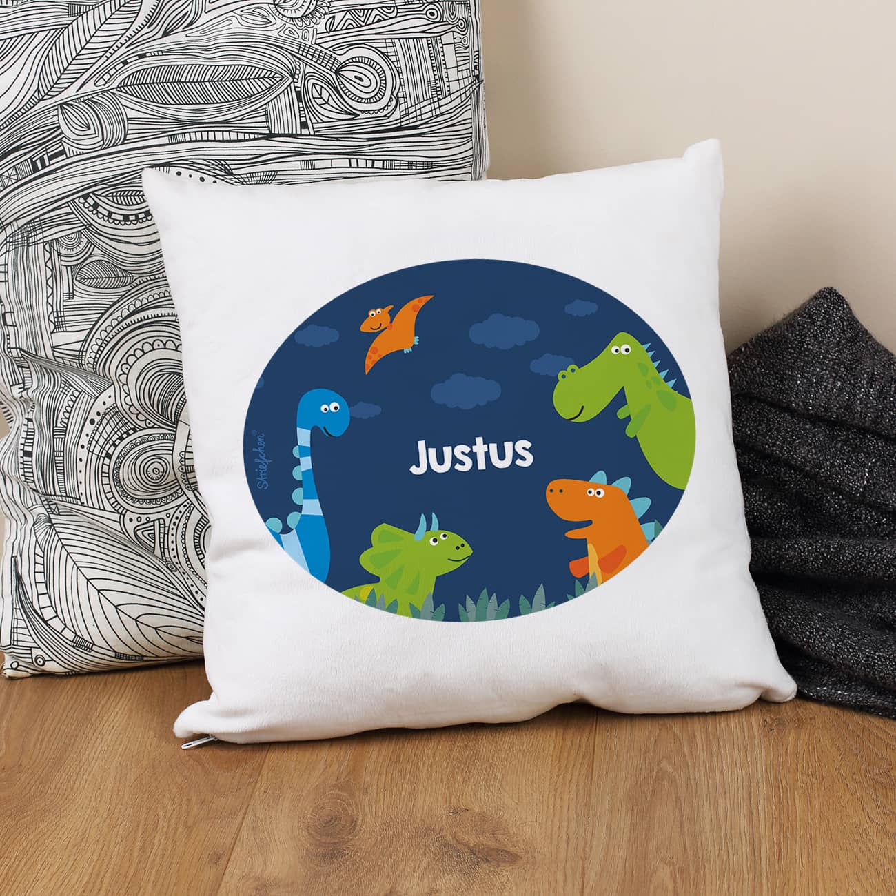 Die Vorderseite des Kissens wird mit einem süßen Dinosaurier Motiv von Striefchen® und Ihrem Wunschnamen bedruckt.