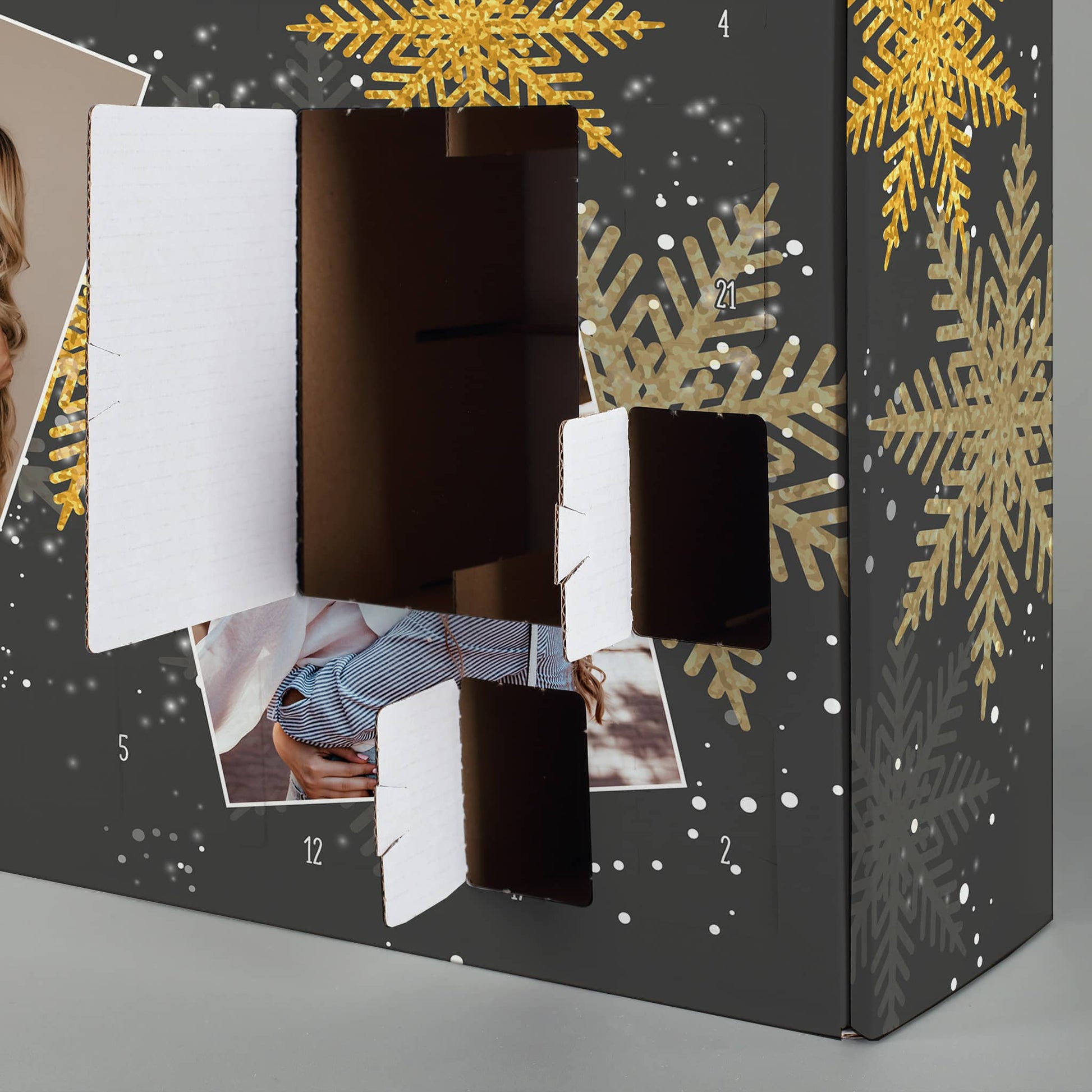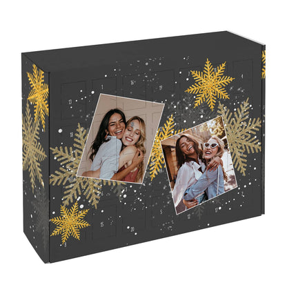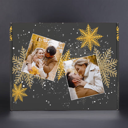 Der personalisierte Foto Adventskalender zum Selbstbefüllen ist ein besonderes Geschenk für die Adventszeit. Gestalten Sie den Kalender mit zwei Ihrer Lieblingsfotos und füllen Sie ihn mit kleinen Überraschungen für Ihre Liebsten. Das elegante schwarz-goldene Design, verziert mit Schneeflocken, sorgt für eine festliche Stimmung. Dieser Adventskalender ist perfekt für alle, die ihren Lieben eine individuelle Freude machen wollen. Mit dem personalisierten Foto-Adventskalender verleihen Sie der Adventszeit eine ganz besondere Note und machen jeden Tag bis zum Heiligabend zu einem Highlight. Einfach füllen, verschließen und verschenken!