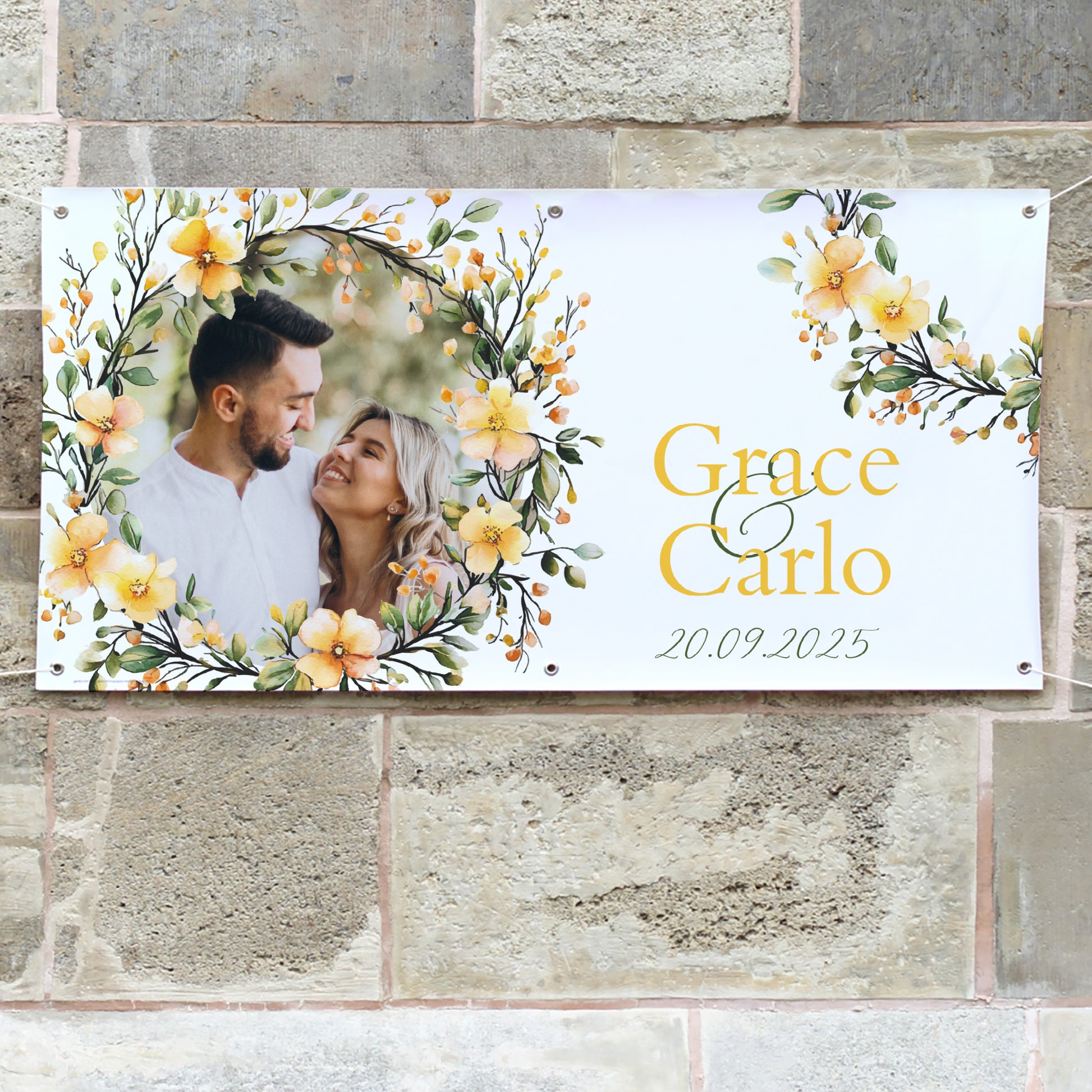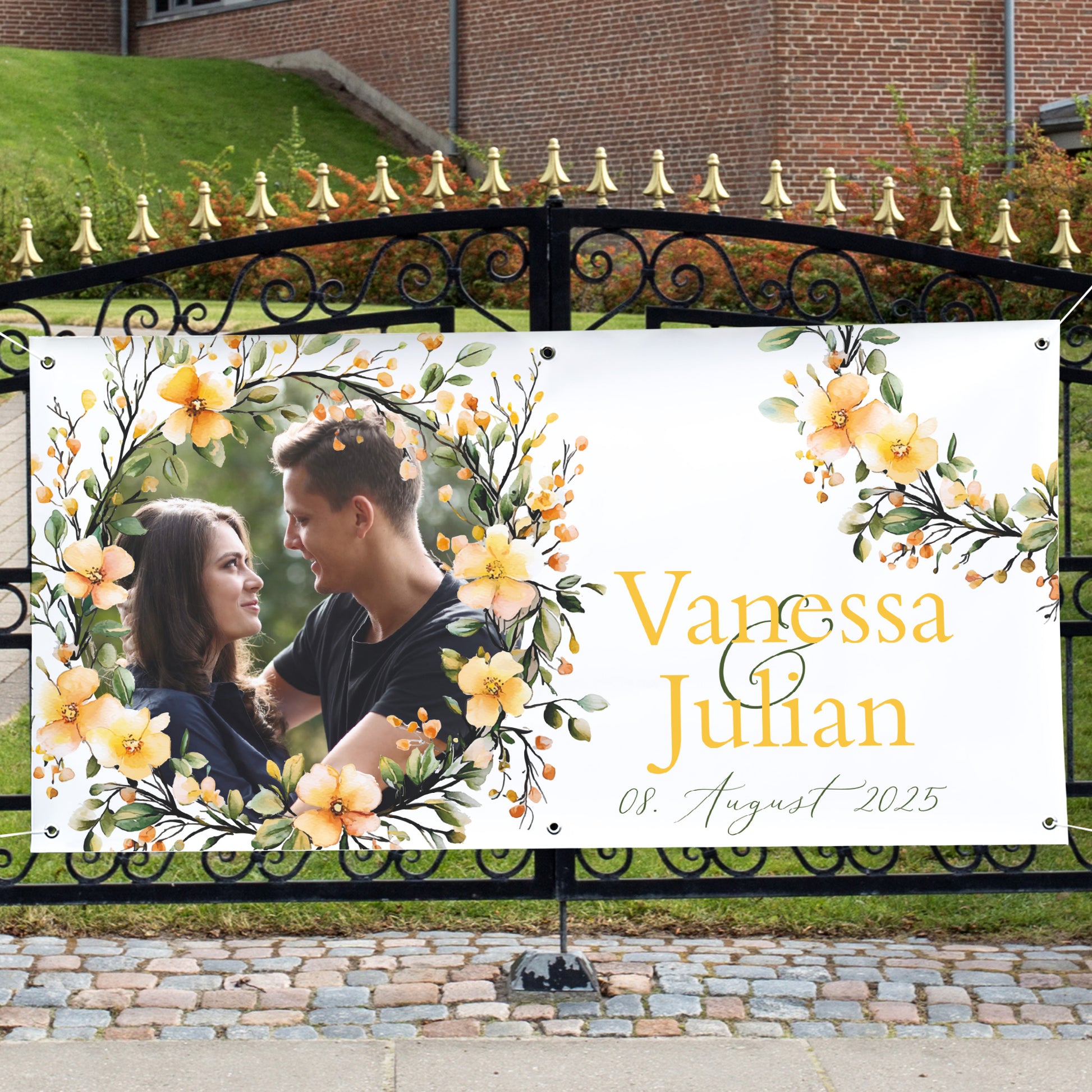 Feiern Sie Ihre Liebe mit einem individuell gestalteten Hochzeitsbanner, das Ihre Gäste stilvoll begrüßt. Dieses romantische Banner mit orangenen Blumen wird mit Ihrem schönsten Foto, den Namen des Brautpaares und dem Hochzeitsdatum bedruckt und schafft eine wunderschöne Atmosphäre – egal ob in der Hochzeitslocation oder unter freiem Himmel.
