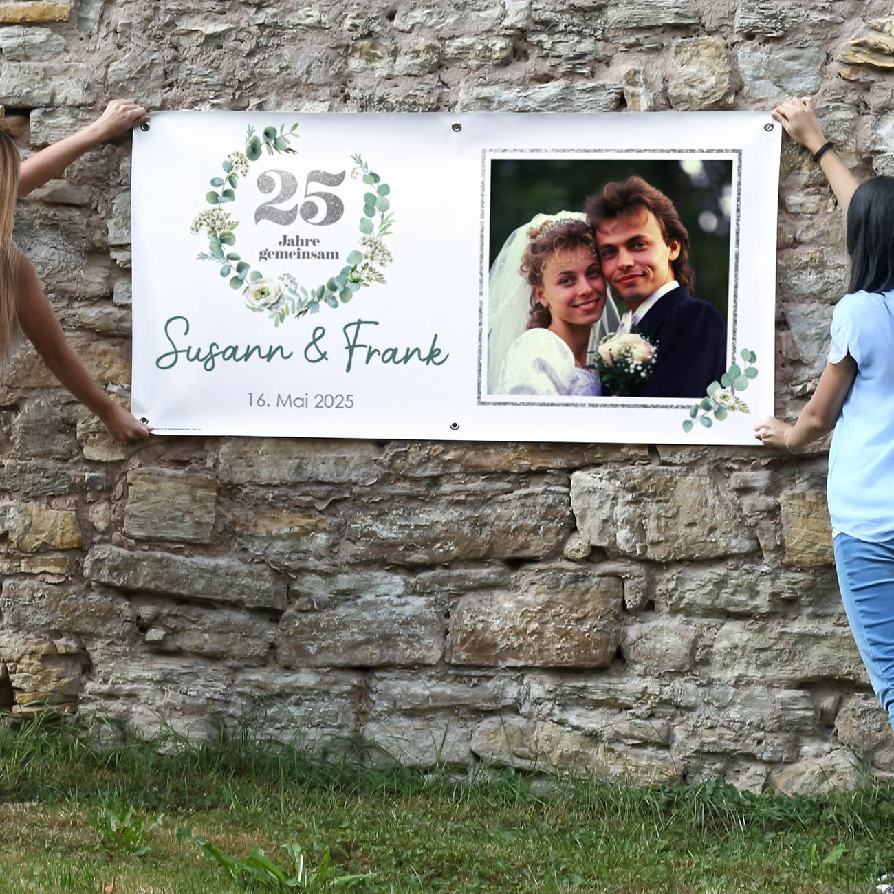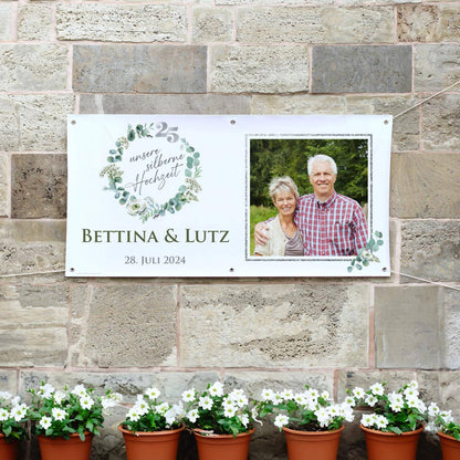 Foto-Banner zur Silberhochzeit mit Eukalyptuskranz, Namen & Datum