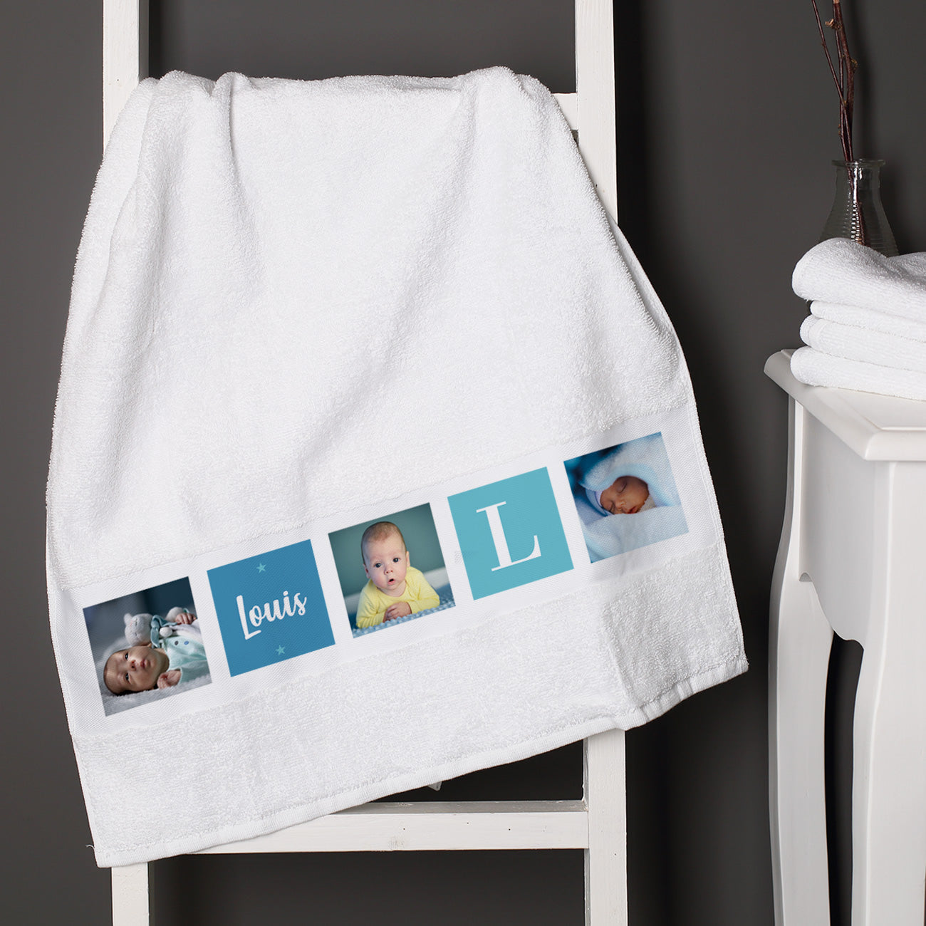 Mit diesem Handtuch schenken Sie ein niedliches Geschenk zur Geburt, Taufe oder auch zum Geburtstag an einen kleinen Jungen. Personalisiert ist dieses Handtuch mit 3 Fotos, Name und Initial Ihrer Wahl in blauen Kästchen. Selbst wenn das Kind dann schon älter ist kann es sich dann noch immer über dieses Handtuch freuen und hat dann einen ganz persönlichen Gegenstand zur Pflege. Besonders Kinder freuen sich immer sehr über Dinge mit Ihrem Namen und Fotos! So hat der Junge auch einen schönen Bezug zu wichtigen Ereignissen, selbst wenn er sich gar nicht an sie erinnern kann. Verschenken Sie noch andere passende Dinge zu diesem Handtuch dazu und schon haben Sie ein schönes Gesamtpaket. Das weiße Handtuch besteht aus 94% Baumwolle und 6% Polyester, wodurch es besonders langlebig und kuschlig weich ist!