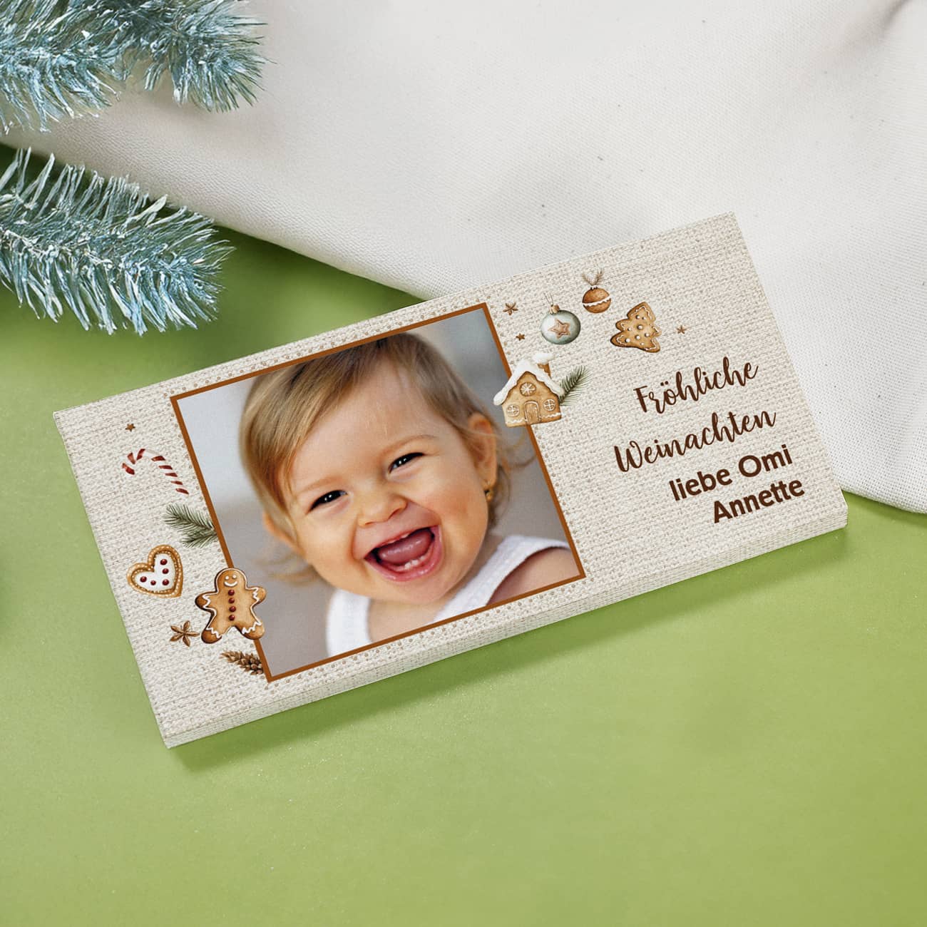 Verschenken Sie süße Weihnachtsfreude mit einer persönlichen Note - die personalisierte Schokolade zu Weihnachten! Diese leckere 100g Vollmilchschokolade kommt in einer individuell gestalteten Verpackung, die mit Ihrem Foto und Wunschtext sowie einem festlichen Lebkuchenmotiv bedruckt wird. Das perfekte Geschenk für Nikolaus, Weihnachten oder einfach, um jemandem eine Freude zu bereiten. Dieses Geschenk richtet sich an alle, die ihre Liebsten mit einer individuellen Aufmerksamkeit überraschen möchten. Besonders geeignet für Familie, Freunde, Kollegen oder als kleines Mitbringsel.