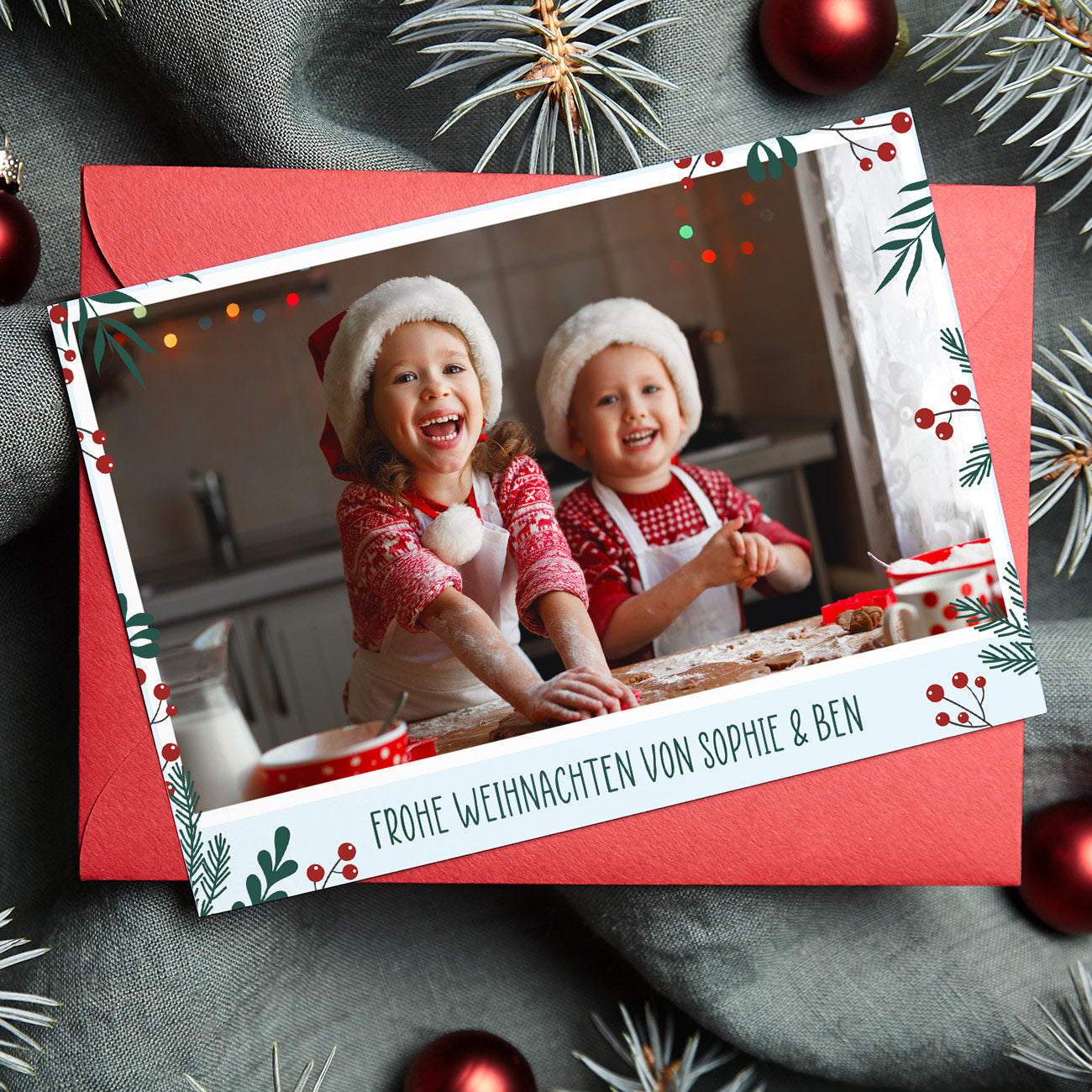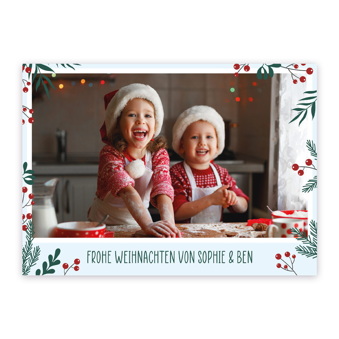 Entdecken Sie eine einzigartige Möglichkeit, Ihren Lieben zu Weihnachten eine persönliche Nachricht zu senden! Unsere Weihnachtspostkarte mit Foto nach Wunsch ist eine besondere Möglichkeit, Ihre Festtagsgrüße zu übermitteln. Diese bedruckte Weihnachtskarte im Postkartenformat ist eine herzerwärmende Art, Ihre Weihnachtsbotschaft zu übermitteln und dabei ein persönliches Bild sowie Ihre eigenen Worte hinzuzufügen. Gestalten Sie die Postkarte mit Ihrem eigenen Foto und einem individuellen Text nach Ihrem Wunsch.