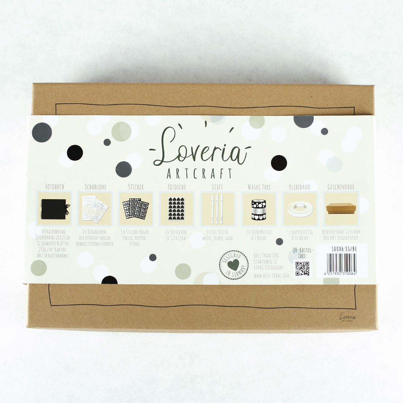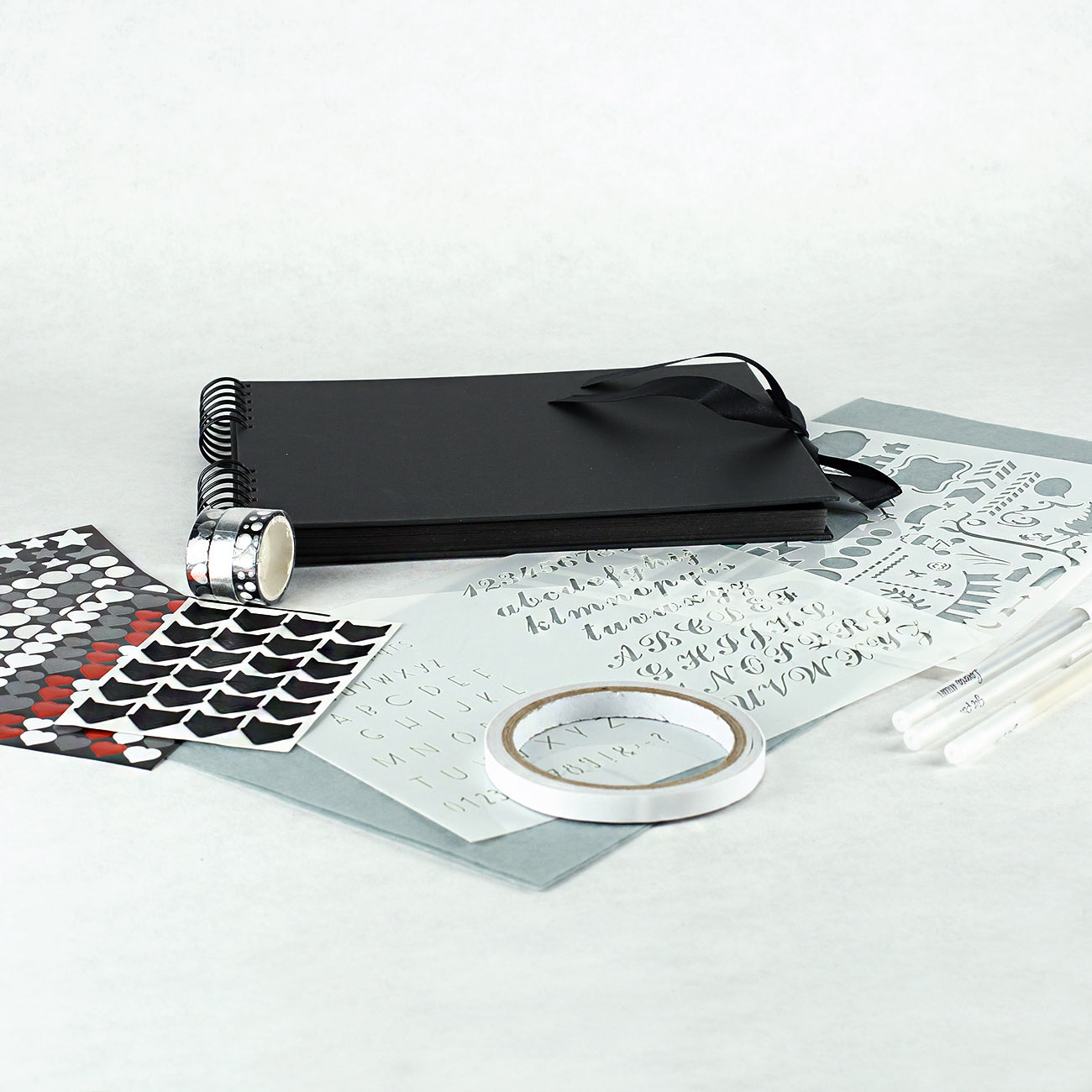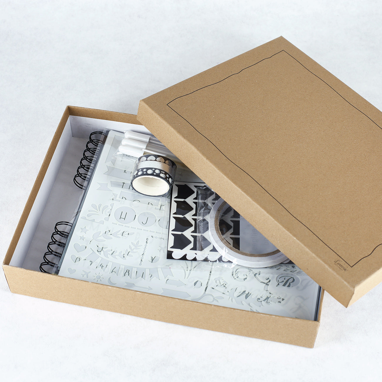 - Inhalt: 1 x Spiralbuch, 2 x Stift, 1 x Rolle doppelseitiges Klebeband, 3 x Rolle Washitape, 3 x Sticker-Bogen, 1 x Bogen Fotoecken, 2 x Schablonen, 1 x Geschenkbox